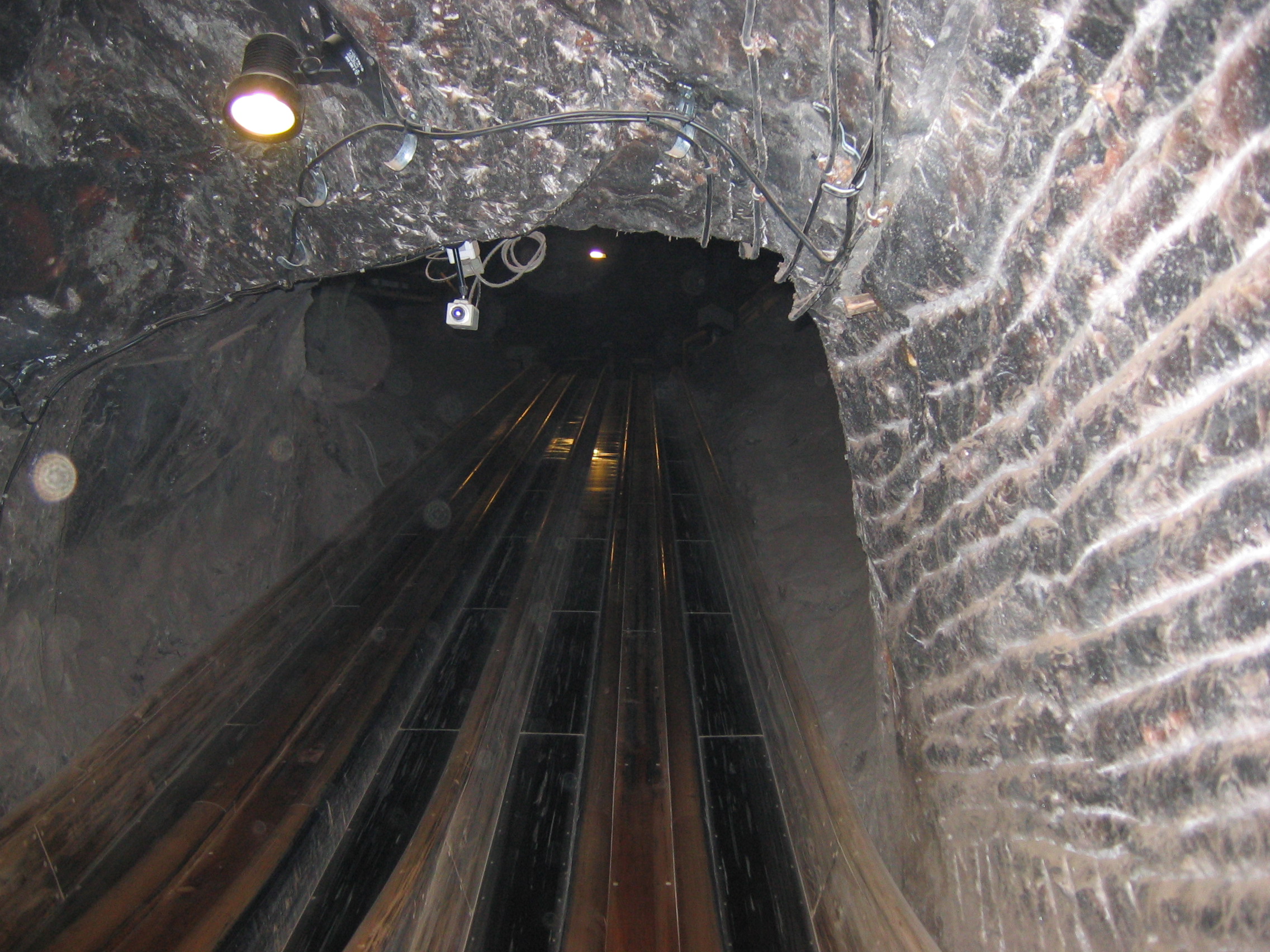 Dunkelheit umgab uns, als die Bahn durch den engen Stollen rumpelte und kuehle Luft wehte bei einer ganzjaehrigen konstanten Lufttemperatur von 12° C. Die gesamte Fahrtstrecke ins Berginnere betrug ca. 700 m.