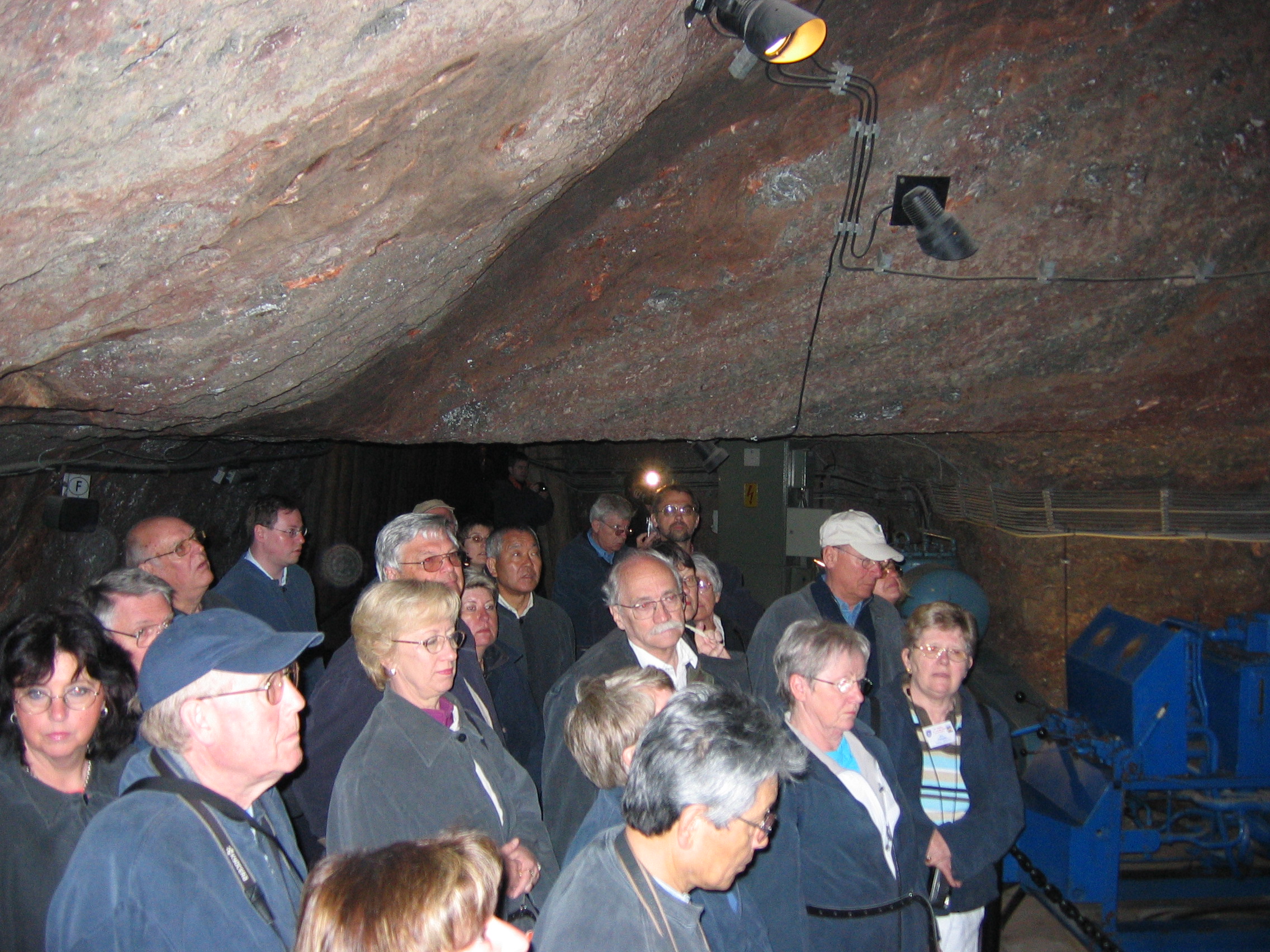 Nach Passieren des beleuchteten Bergmann-Symbols ¨Schlegel & Eisen¨ erreichten wir eine grosse Halle, in der in vielen Darstellungen der traditionelle ¨Sinkwerksabbau¨ gezeigt wurde. Ein Film erklaerte uns, wie das Salz in den Berg gekommen war. Die unterirdischen Salzstoecke haben ihren Ursprung in der Verdunstung von Meerwasser vorzig Millionen Jahren. Das entstandene Salzgestein (50 % Salzanteil) wird im sog. ¨nassen¨ Abbauverfahren aus dem Gebirge herausgeloest und anschliessend in Schraegschaechten mit Suesswasser versetzt.