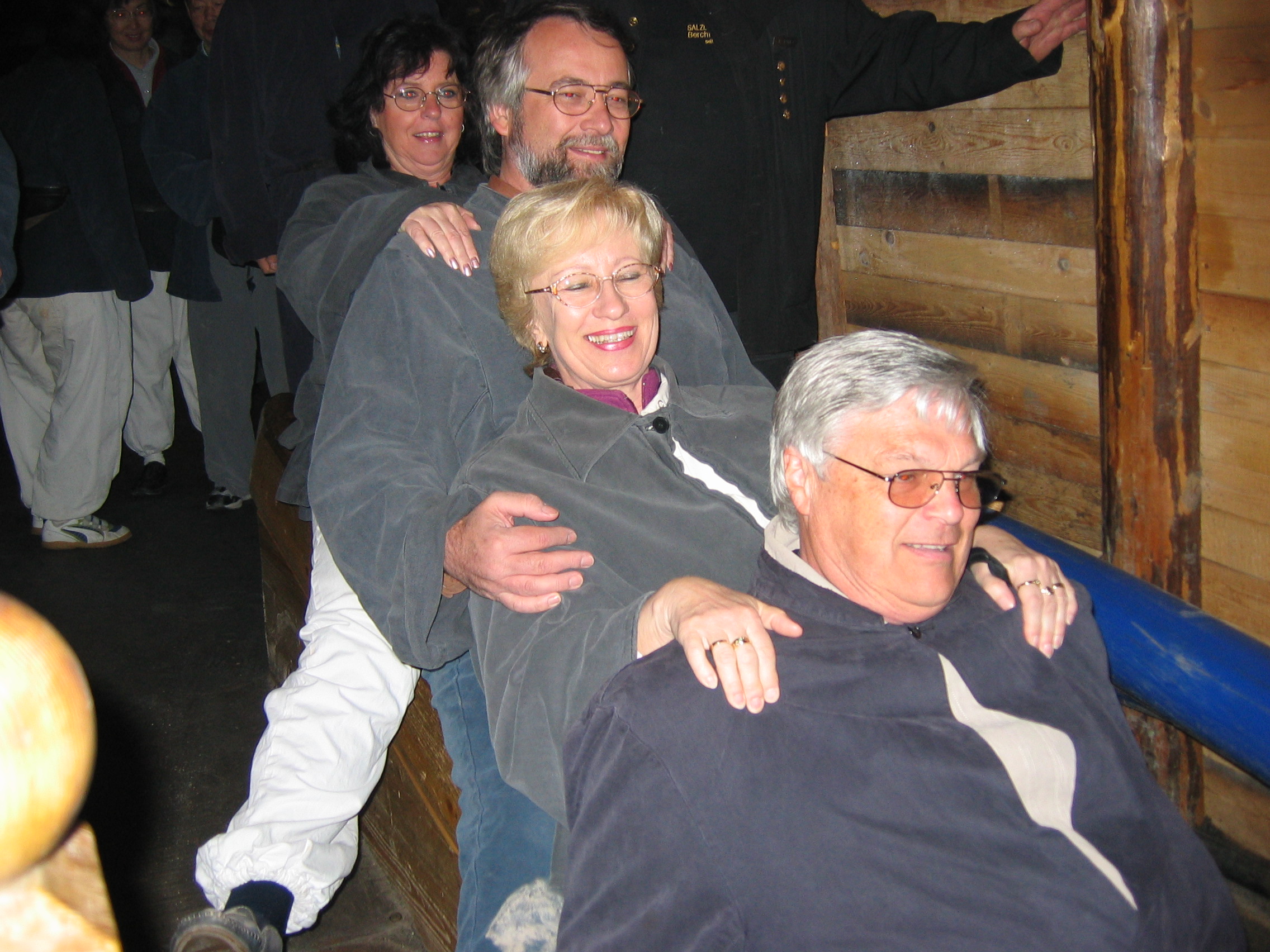 Wir setzten uns immer in Gruppen zu vier oder fuenf Personen zusammen, schoen eng, hielten uns aneinander fest – wobei der erste Mann oder Frau sich nur zuruecklehnen konnte. Alle andern hatten ja einen Vordermann.