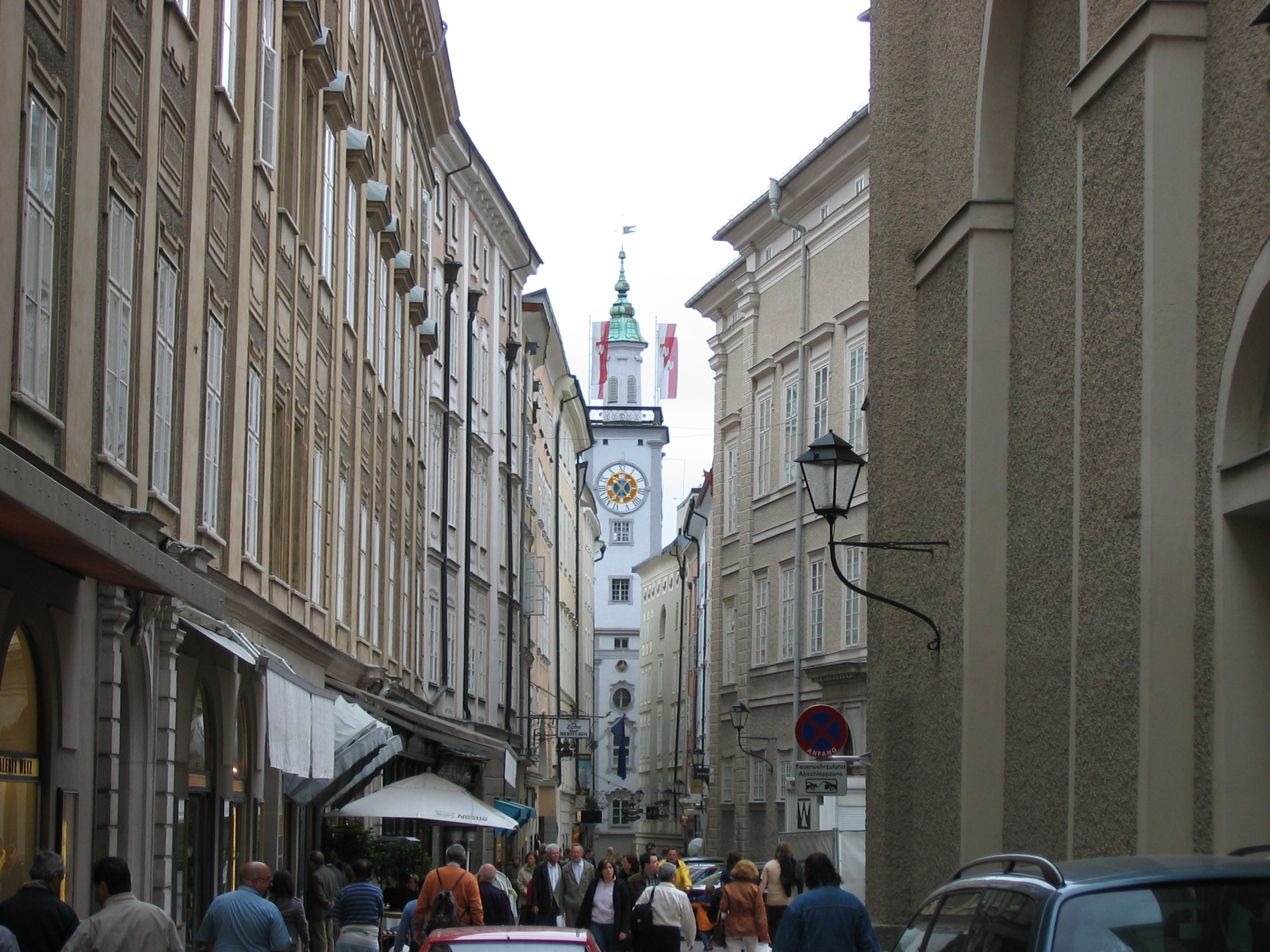 Natuerlich waren wir auch in der Strasse, in der Mozarts Geburtshaus steht: Getreidegasse Nr. 9!
