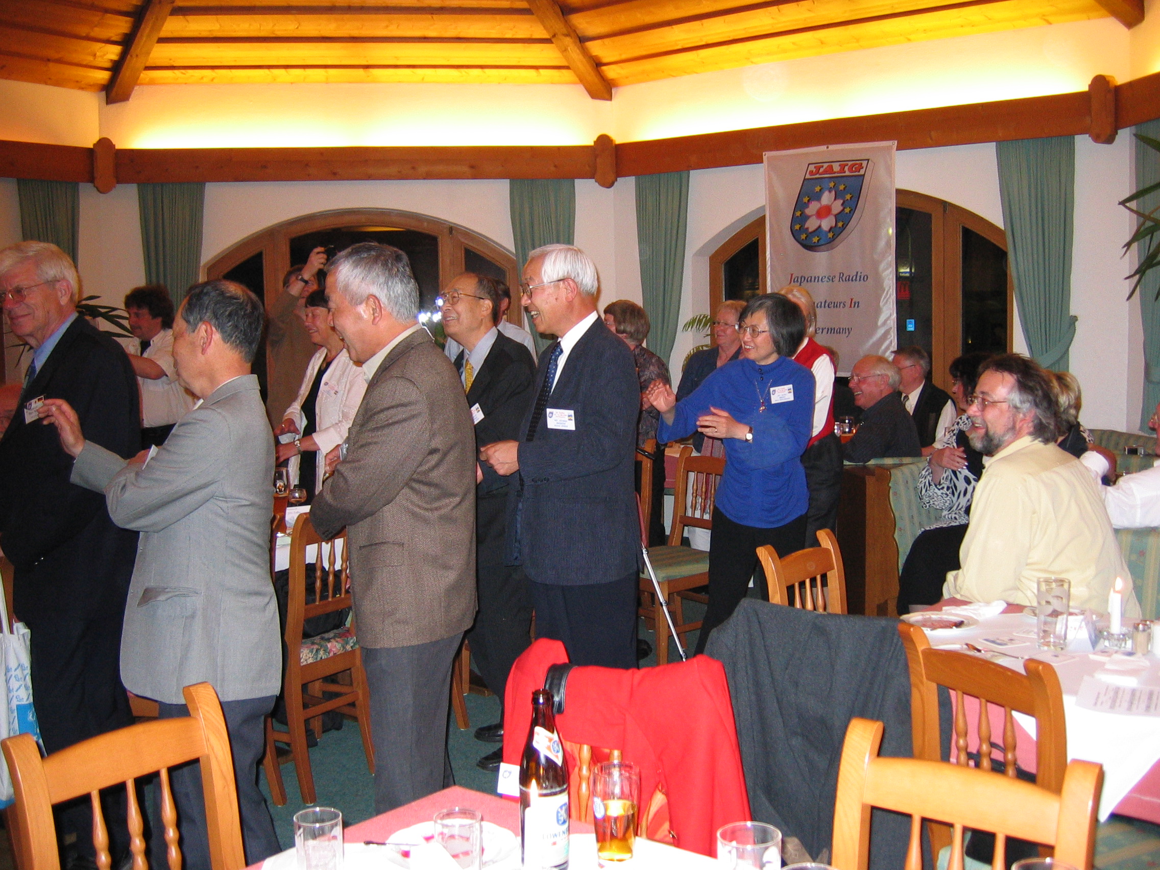 Na, und selbstverstendlich durfte er auch nicht fehlen: der gemeinsame Gesang eines japanischen und eines deutschen Volksliedes. Und dafuer hatten wir jemanden besonders Preadistinierten: OM Miyamoto, JE3BEQ, (unter uns: der Karaoke-Koenig von Osaka – JAIG-Treffen 2004 in Japan). Er hatte seinen leuchtenden Dirigentenstab mit und da gab es kein Entrinnen.