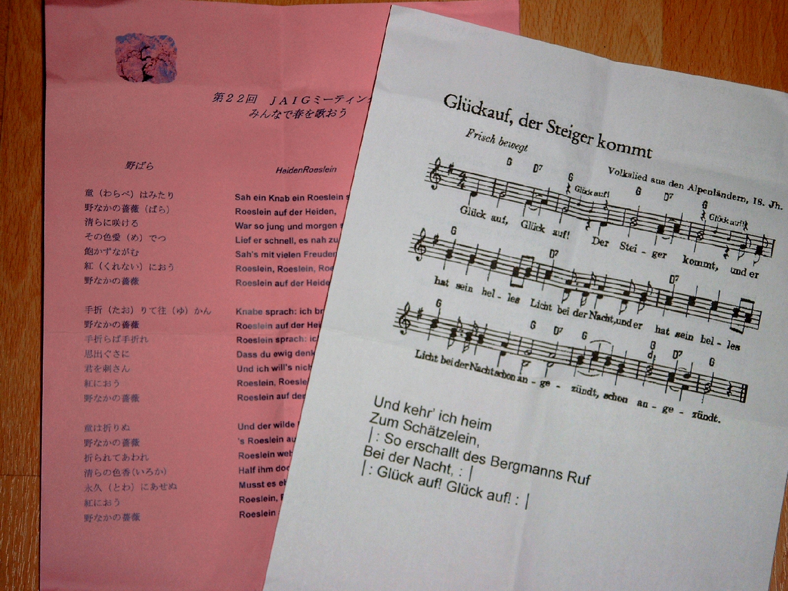 Wir sangen gemeinsam -Glueckauf, der Steiger kommt....-, alle 6 Strophen und wir sangen natuerlich das -Heideroeslein- auf deutsch und japanisch. Ich vermute, wir sangen es gleichzeitig, denn ich habe so laut gesungen, dass ich die anderen gar nicht gehoert habe, hi. Hoffentlich hat das niemanden gestoert.