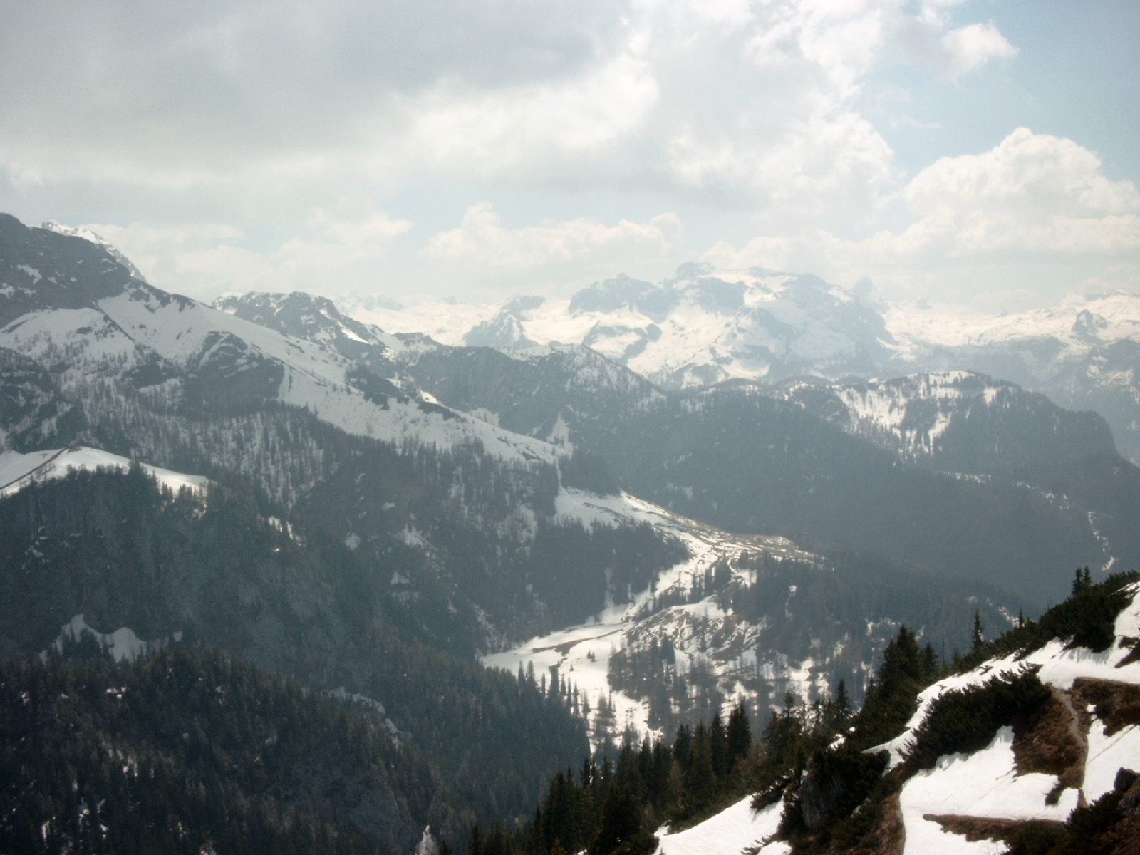 Als wir auf der Aussichtsflaeche unterhalb des Gipfelkreuzes angekommen waren, staunten wir nicht schlecht, dass die Aussichtsflaeche noch zu gut 70% mit meterhohen Schneemassen bedeckt war, um die man herumgehen musste. Fuer unsere Muehe mit dem Aufstieg wurden wir durch einen herrlichen Ausblick belohnt. Von hier aus gab es eine gute Sicht auf den Koenigssee mit der Schiffs-Anlegestelle, auf St. Bartholomae und auf die gegenueberliegende „Koenigssee'r Rodelbahn“, die von hier oben aussah wie eine kleine Autobahn, die aus dem Berg kommt. Ueber dem Koenigssee war der „Watzmann“ in seiner vollen Pracht zu sehen. Von diesem Blickwinkel aus zeigten sich in voller Pracht ¨Frau Watzmann¨ und die Kinder des Herrn ¨Watzmann¨, so wie es die Sage erzaehlt. Gluecklicherweise hatte ich mein Fernglas dabei, mit dem wir uns einiges naeher betrachten konnten und einen Fotoapparat zum Festhalten dieser schoenen Momente.