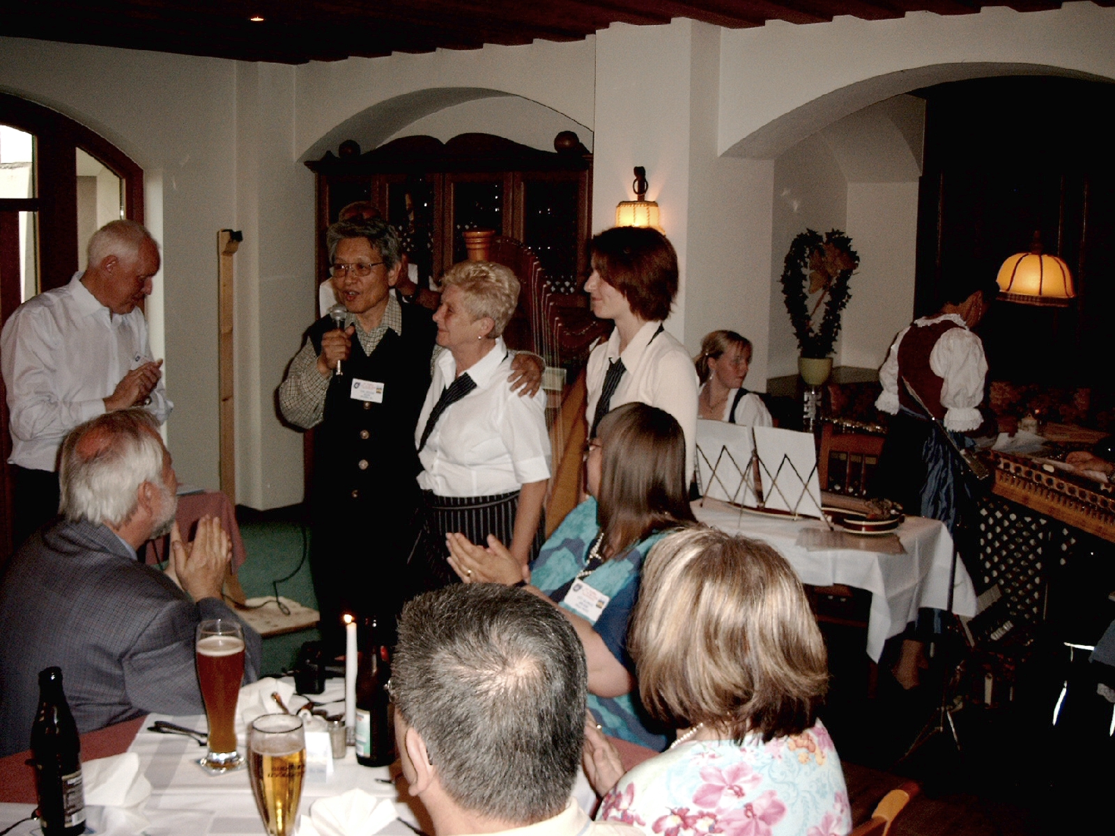 Da war der ehemalige Bergbau-Ingenieur Hans-Otto, DF8PO, der uns eine tragik-komische Liebesgeschichte aus dem Bergmannsleben des 19. Jahrhunderts vortrug. Danach wurden wir ueberrascht von der Familienkapelle aus Wagrain. Sie spielten ein traditionelles japanisches Bergmannslied. Da sprangen alle Japaner auf und sangen und tanzten mit. Das war eine Stimmung...!