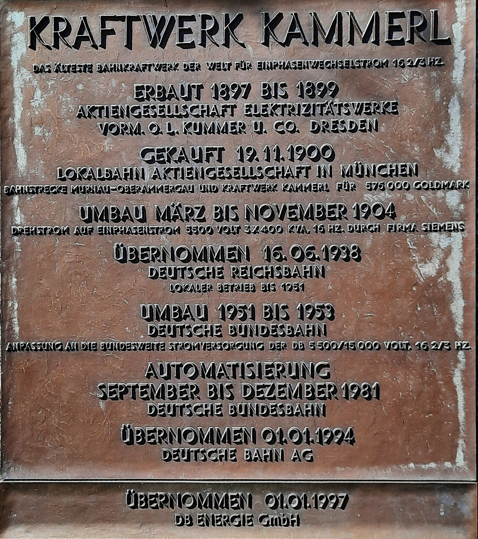 Bei Oberammergau, in der Naehe von Garmisch-Partenkirchen befindet sich am Fluss Ammer das „Wasserkraftwerk Kammerl“. Das Kraftwerk wurde von 1897 bis 1899 gebaut und sollte die elektrische Energie fuer die neue Bahnlinie von Murnau nach Oberammer-gau liefern. Nach anfaenglichen Schwierigkeiten konnten die Lokomotiven ab 1905 mit elektrischem Strom versorgt werden.