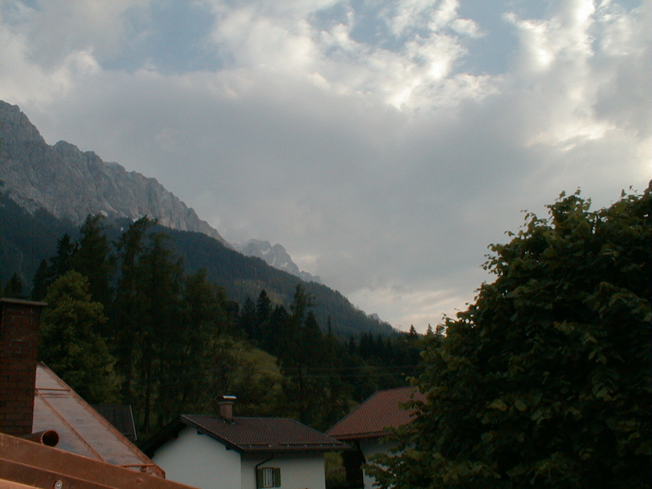 Fuer den ungeuebten Leser mag es so erscheinen, als ob wir pflichtgemaess in Lobeshymnen verfallen. Mal abgesehen davon, dass die Gegend um Garmisch-Partenkirchen unsere Werbung weiss Gott nicht noetig hat, so ist es doch fuer einen Grossstaedter (ich koennte auch sagen Hauptstaedter - wegen der Werbung), der mehr als 80% seiner Jahreszeit den Stein der Stadt vor Augen hat, dessen Horizont durch die Traufhoehen der ihn umgebenden Haeuser bestimmt wird, dass es fuer so einen armen Gross....., ich meine Hauptstaedter bereits eine Erholung ist, wenn er weiter als 50m bis zum Horizont blicken kann, und dann mit solch einer Kulisse. Ja, man kann sich hier nicht genug satt sehen.