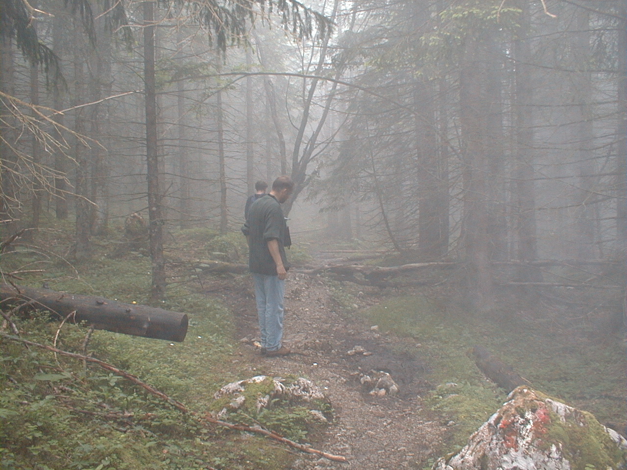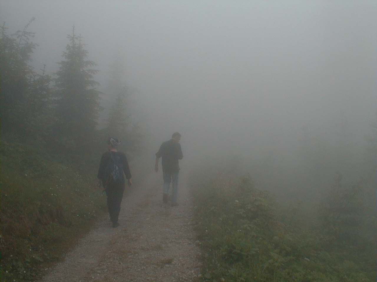 Nach einigen Minuten lichtete sich der Wald zwar, aber der Nebel blieb. Die Sicht war immerhin schon so gut, dass wir einen groesseren Weg erkannten, der uns dann sicher zum Ziel, die Hochtoerl-Huette, fuehrte. Hier konnten wir unsere Sachen trocknen, uns selbst mit 1-2 Grog aufwaermen und einen herzhaften Happen essen.