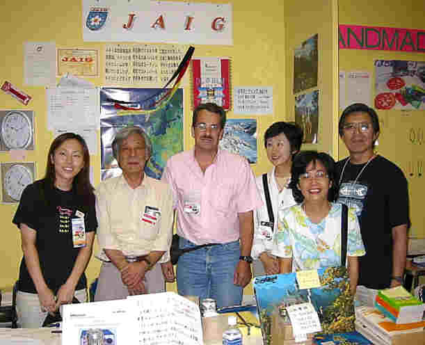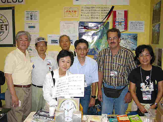 Waehrend der HAM-FAIR hatten wir bei unserem JAIG-Stand viele Besucher. Wir waren sehr ueberrascht von einem ploetzlichen Besucher aus Deutschland. Der Besucher war ein JAIG-Mitglied, Nestler san (DL4NDV/7J1AQU), der jetzt in Kakegawa (JCC#1814, Shizuoka) wohnt. Er sagte, dass er wegen seiner Arbeit zwei oder drei Jahre lang hier in Japan wohnen wird und er plant gerade waehrend des Aufenthalts in Kakegawa auf Kurzwelle zu funken, dann koennen wir sicher beim sonntaeglichen JAIG-NET QSO fahren.
