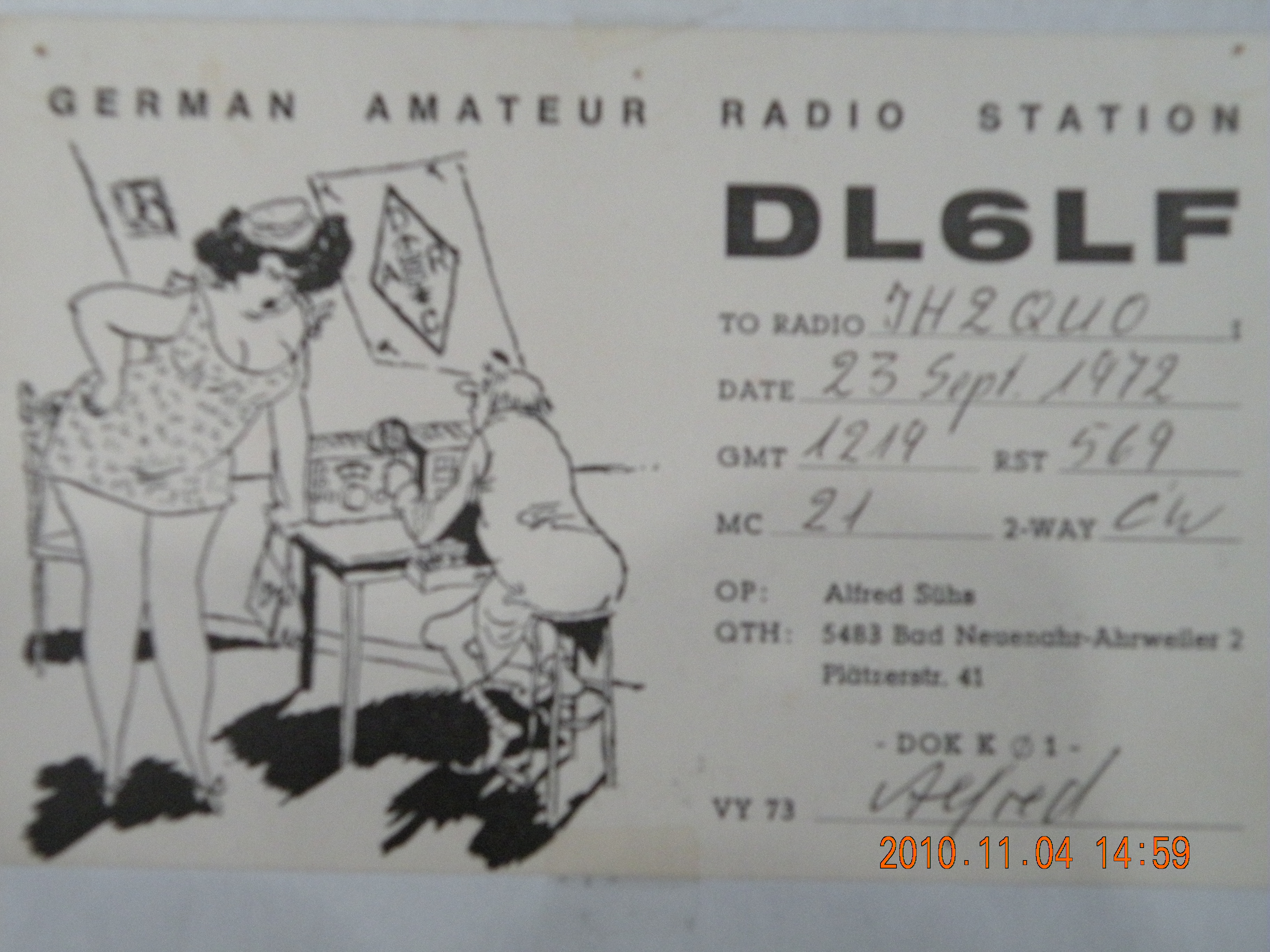 In Tokio-Asakusa habe ich 1952 das Rufzeichen JA1FY zugeteilt bekommen. Mit DX QSO habe ich sehr spaet angefangen und zwar aus der Stadt Numazu mit dem Rufzeichen JH2QUO. Die erste QSO mit 21 MHz in CW mit einer deutschen Station DL6LF, namens Alf, hatte ich am 23. September 1972. Als ich von Alf die QSL Karte erhielt, habe ich mich riesig gefreut. Auf der Karte ist eine Karikatur abgebildet, genauso wie unser Haus ausgesehen hat. Danach hatte ich mit vielen QSO mit deutschen Stationen viele QSO.