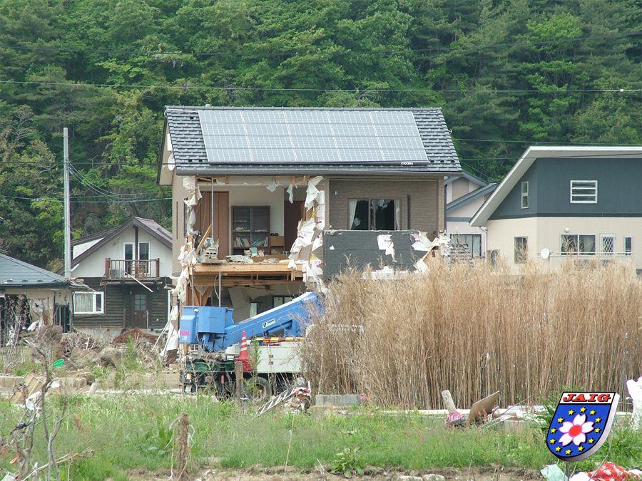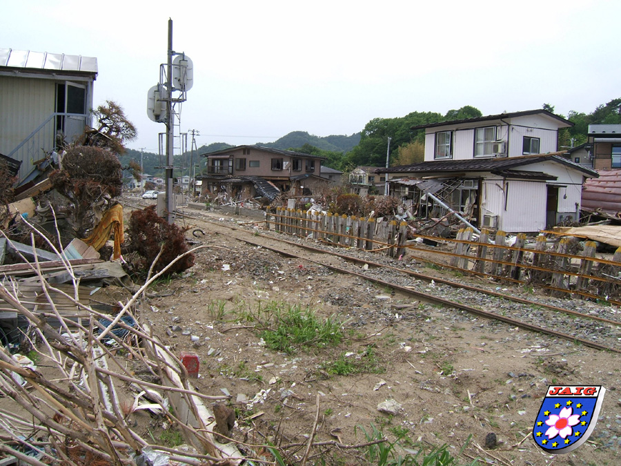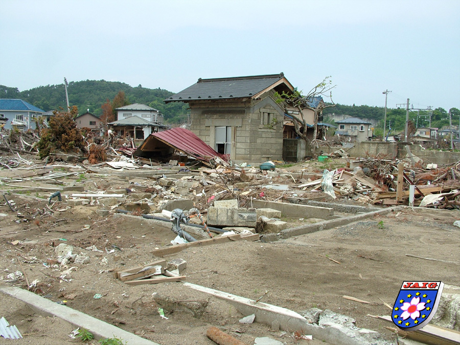 Die betroffenen Kuestengebiete, die in der Karte gruen markiert sind, haben eine Laenge von ca. 580 km!! Die Wassermassen drangen in vielen Gebieten kilometerweit ins Landesinnere vor und erreichten teilweise eine Hoehe von ueber 30 m. Davon besonders betroffen waren die Praefekturen Iwate und Miyagi, weil es dort fjordaehnliche Kuestengebiete gibt und sich die Wassermassen in den "engen" Gebieten ihren zerstoererischen Weg bahnten. Naeheres koennt Ihr in Berichten von Hans, DF2MC und Mitsuko-san, DN2MC und uns beiden nachlesen.