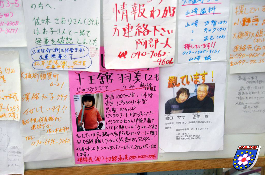 Ein Ortsteil von Otsuchi wurde durch den Tsunami von der Aussenwelt abgeschlossen. Ein Funkamateur der dort wohnte, hat SOS gefunkt. Er hatte gluecklicherweise die letzten Jahre alte Autobatterien gesammelt und konnte mit dieser Stromversorgung SOS senden. Die Stromversorgung war bereits nach dem Erdbeben ausgefallen. Er wurde von einem Funkamateur in Osaka gehoert, der die Polizei verstaendigen konnte, die dann einen Militaer-Hubschrauber zur Rettung schickte.