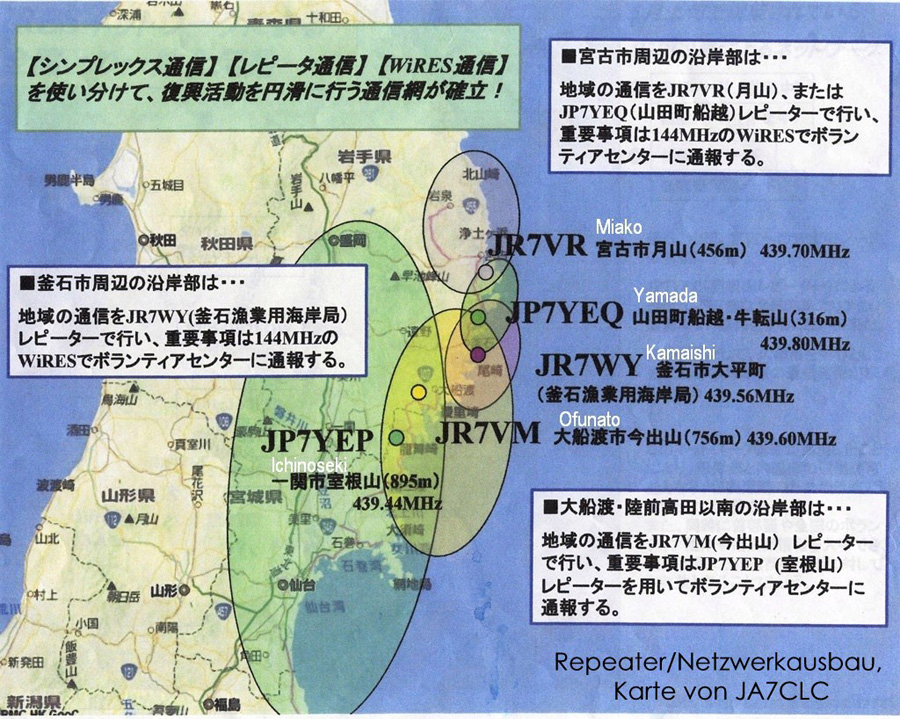 Nach dieser Katastrophe bauen die Funkamateure entlang der Kueste in Iwate, Miyagi bis Fukushima ein Netzwerk mittels Relais auf 2m / 70cm und dann ueber WiRes (Internet) auf.