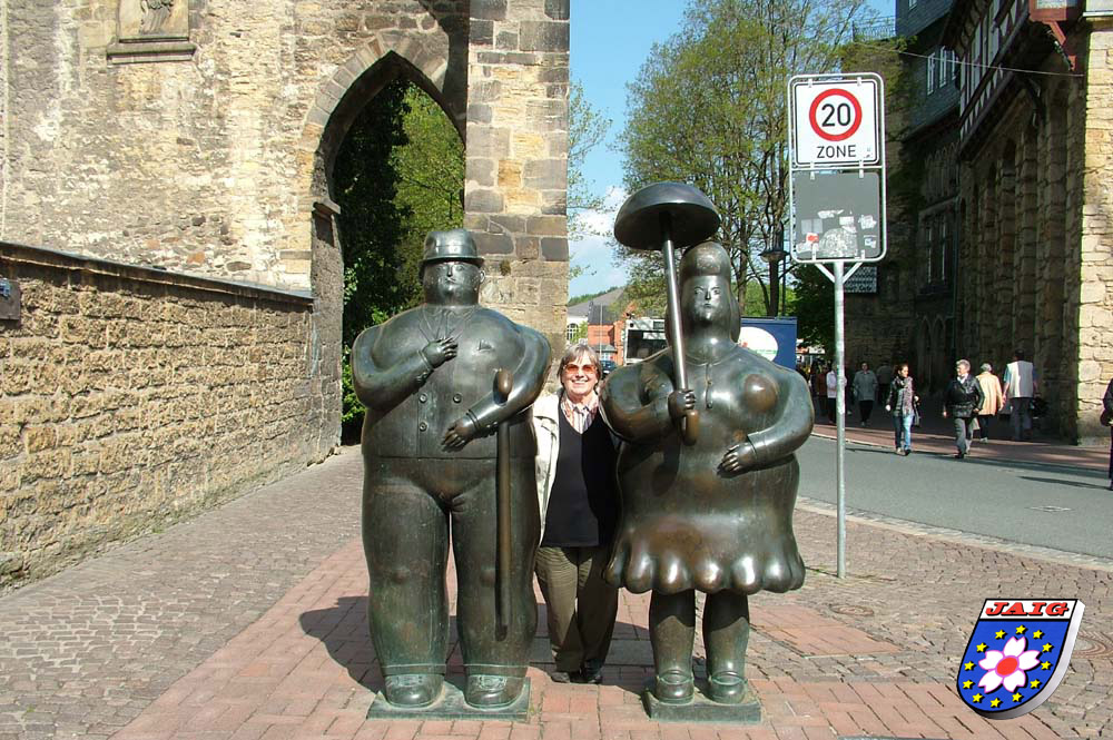 Am 6. Mai gab es den ersten Busausflug. Zuerst waren wir im Eisenbahnmuseum Vienenburg, dort wurden wir von Buergermeisterin, die jung und sehr huebsch war, empfangen. Nach der Fahrt zum Torfhaus sind wir nach Goslar zurueck gekommen und mit einem Stadtfuehrer haben wir die Kaiserpfalz besichtigt und danach einen Rundgang durch die Altstadt gemacht. Alte Stadtteile hatten wir bereits am Vortag gesehen, aber mit der Stadtfuehrung bekamen wir noch einen anderen Eindruck. Die Haeuser an der Strasse waren mit Blumen geschmueckt, das machte einen noch schoeneren Eindruck.
