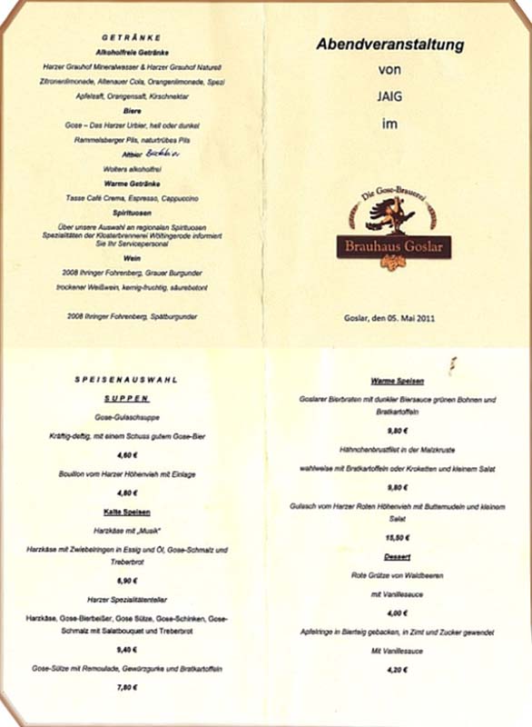 Nachdem am Donnerstagabend (05.05.2011) im Goslarer Brauhaus bei leckerem Essen und koestlichem Bier froehliches Wiedersehen gefeiert wurde, hiess es am Freitagmorgen zeitig aufstehen. Denn nach einem guten Fruehstueck stand kurz nach 8 Uhr der Bus zur Abfahrt bereits vor unserem Hotel.