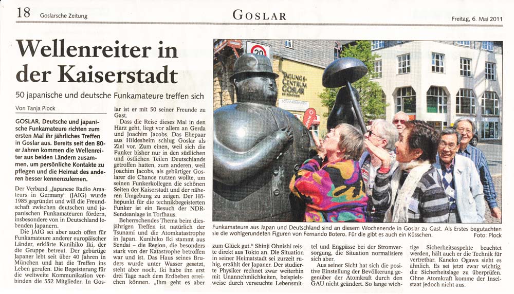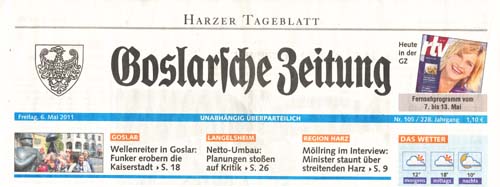 Am Freitag, 06.05. erschien in der "Goslarsche(n) Zeitung" ein Artikel ueber unser Treffen mit der gefaelligen Ueberschrift "Wellenreiter in der Kaiserstadt".