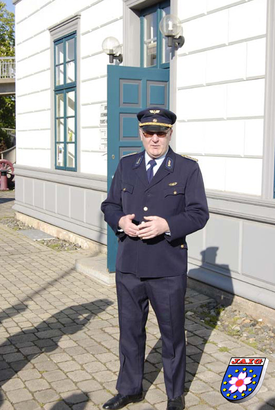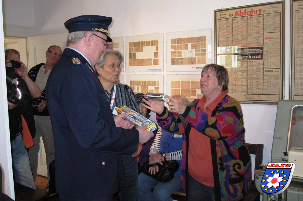 Als erstes ging es nach Vienenburg, zum Eisenbahnmuseum. Dort erwartete uns Peter, DF7AA in einer historischen, schmucken Eisenbahneruniform und wir erhielten einen "Hexen"-PIN als Andenken. Herr Moritz uebernahm die Erklaerungen und beim Betrachten der alten Geraete und Einrichtungen fuehlten sich viele von uns in die Kindheit und Jugendzeit zurueckversetzt, als z.B. die Papp-Fahrkarten noch mit der Lochzange entwertet wurden, die Signale noch von Hand mittels Hebel gestellt wurden etc.