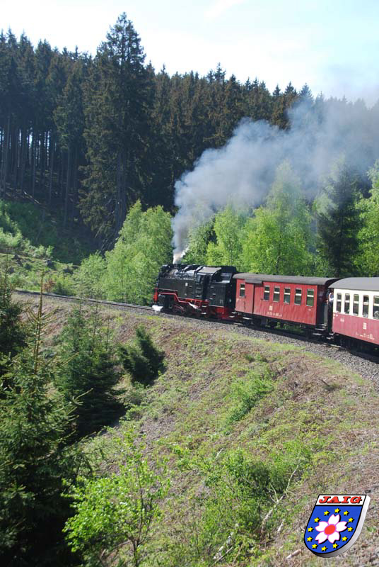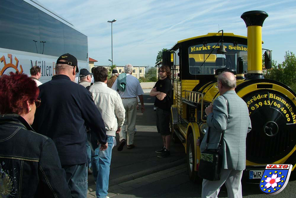 Samstags, 07.05. hiess es um 08.15 Uhr wieder am Bus sein. Dieses Mal war aus organisatorischen Gruenden ein anderes Unternehmen "eingesprungen". An diesem Tag war Peter, DF7AA unser Reisebegleiter. Die erste Fahrt ging nach Wernigerode, wo eine Fahrt mit der Bimmelbahn fuer unsere Freunde geplant war. Wir wurden am Bahnhof abgeholt und los ging's mit dem gelben Zug in Richtung Stadt.