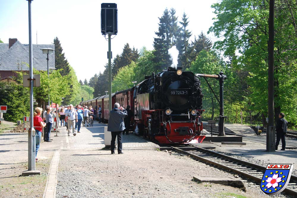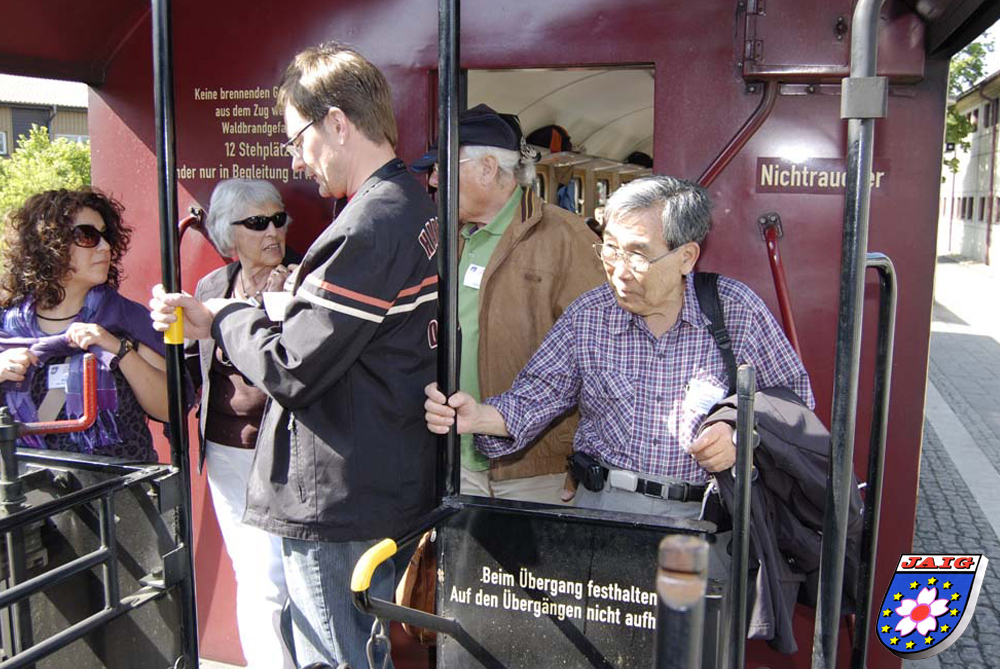 Leider konnte die Bimmelbahn nicht bis ins Zentrum fahren, was viele unserer Freunde sehr bedauerten. Peter und Erika winkten uns nach und besorgten dann die Fahrkarten fuer die Fahrt mit der Harzbahn. Peter machte sich mit unserem Busfahrer auf den Weg nach Drei Annen Hohne und ich versuchte, so gut als moeglich, wenigstens einige Sitzplaetze in der hoffnungslos vollen Dampfeisenbahn zu belegen. Leider gelang es nur teilweise und so mussten einige unserer Freunde auf der Plattform der Waggons stehen. Gottlob hatten sie alle Verstaendnis und kamen auch nicht "russgeschwaerzt" in Drei Annen Hohne an.