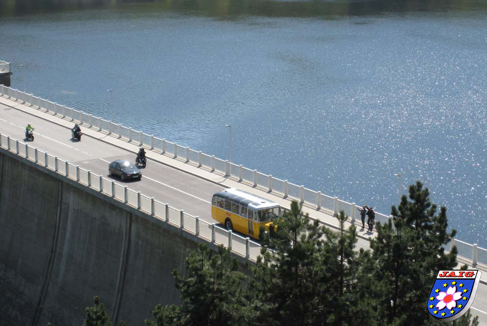 Bei der Weiterfahrt zur Rappbodetalsperre wunderten wir uns, dass ploetzlich unser Bus und andere PKW's, auch aus dem Gegenverkehr, angehalten wurden. Zwei Motorradfahrer hatten sich mit ihren Maschinen in der Strasse postiert und hielten den "fliessenden" Verkehr an. Aus der Seitenstrasse kamen viele Motorradfahrer mit ihren Maschinen, alle Marken und Arten waren zu sehen, allein und mit Partner(innen), auch mit Beiwagen, fuhren an uns vorbei (eine gute Idee und vernuenftige Loesung) und bedankten sich fuer das Verstaendnis. Vermutlich hatten sie ein groesseres Treffen irgendwo im Harz und wollten moeglichst geschlossen dorthin kommen.