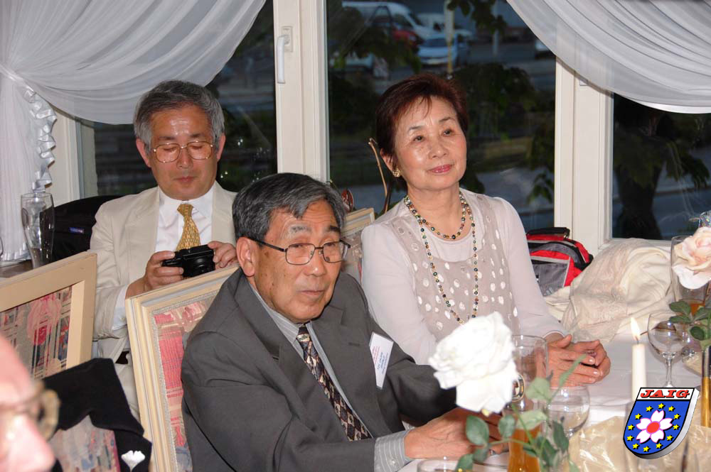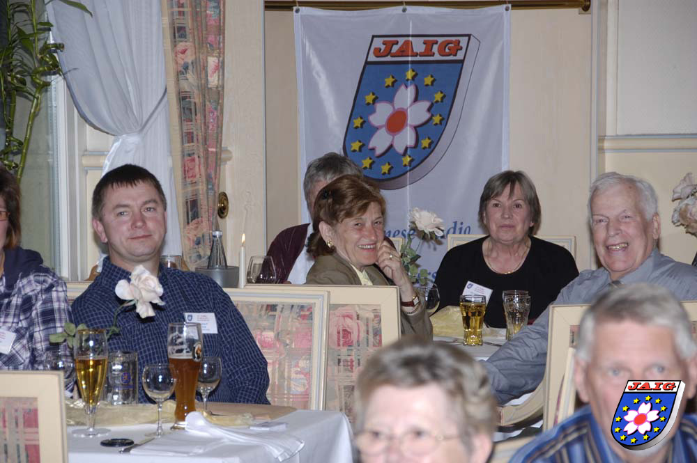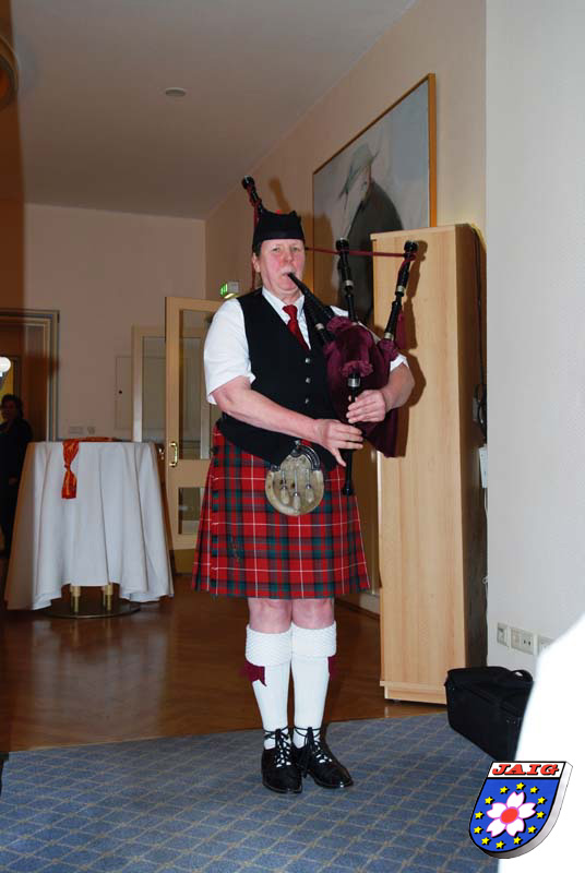 Nun zum Hauptteil des JAIG-Treffens - das Meeting hat abends angefangen. Alle Teilnehmer hatten huebsche Kleidung angezogen. Ich habe an einem Tisch mit Joachim und Gerda gesessen. Von Iki-san sind wir drei aus Japan Angereisten extra vorgestellt worden. Als Unterhaltungsmusik habe ich ein schottisches Dudelsackspiel gehoert. Ich habe so etwas zum ersten Mal gesehen bzw. gehoert und war sehr beeindruckt, weil der Ton so schoen war.