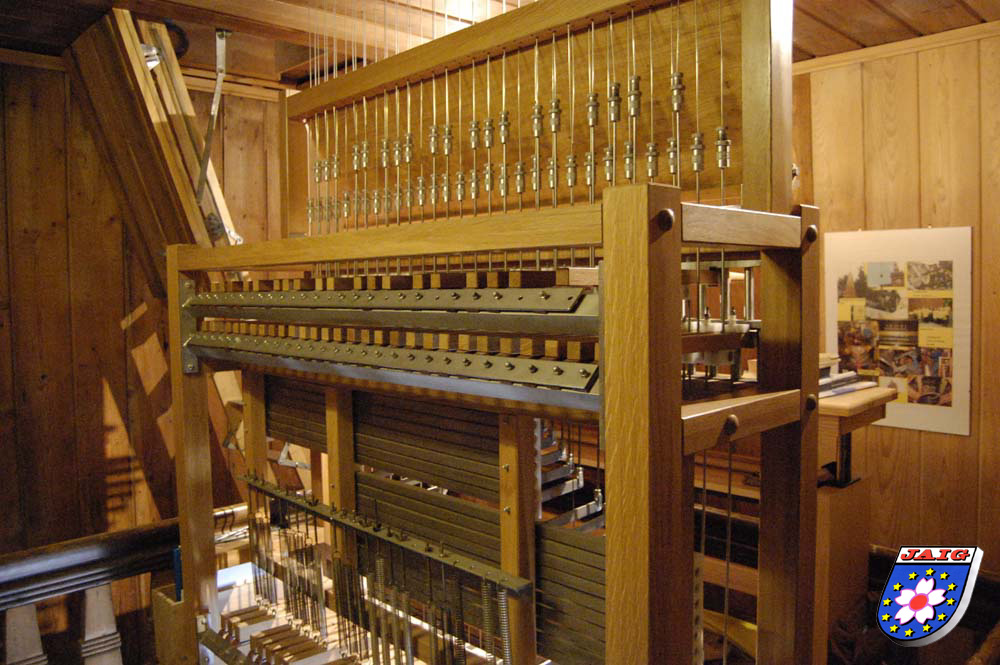 Seit 2004 beherbergt der Turm neben den ueblichen Glocken ein Carillon, ein grosses Glockenspiel, bei dem die Kloeppel der Glocken ueber Zugdraehte mit den Tasten des Spieltisches verbunden sind.