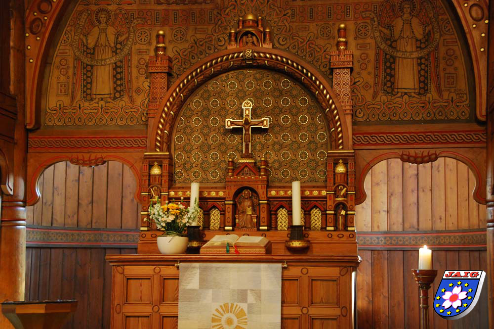 Die Kuesterin uebernahm die fuer unsere Gruppe vorbestellte Fuehrung. Von ihr erfuhren wir viel Interessantes ueber diese, in ihrem Erscheinungsbild etwas ungewohnte Kirche. Sie wurde von Prof. Karl Heinrich Friedrich Mohrmann nach dem Vorbild norwegischer Holzbaukunst geplant und am 28. Juni 1908 geweiht. Zunaechst war allerdings eine neugotische Steinkirche vorgesehen. Da aber die voraussichtlichen Baukosten die finanziellen Moeglichkeiten weit uebertrafen, sich jedoch genuegend Holz vor Ort befand und damit die Errichtung viel preisguenstiger schien, entschied sich Prof. Mohrmann fuer eine Holzkirche, die sich zudem harmonisch in die Oberharzer Landschaft einfuegt.