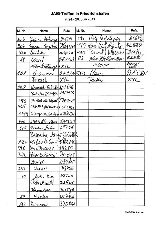 Dieses Mal kamen auch wieder Freunde aus Japan angereist. Zusammen mit Kawai-san, JA1FUY und Fukuda-san, JA1IFB kam Tanabe-san, JA1OGX, nach Friedrichshafen, er ist mit der Nummer 557 unser "juengstes" Mitglied. Naguro-san, JA1IST ist nach vielen Jahren wieder einmal an den Bodensee gekommen. Zusammen mit Matsunaga-san, DJ1YM und seiner XYL kam auch Sugitani-san, JA9BFM zu uns. Es war ein schoenes Wiedersehen mit unseren japanischen Freunden.