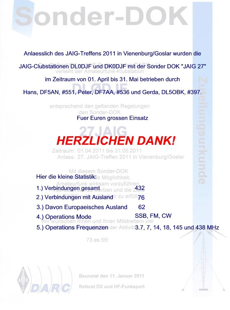 Wir moechten noch auf unser JAIG-News Archiv, Ausg.01-100 in Form einer CD aufmerksam machen. Wer daran interessiert ist, kann sie bei uns anfordern. Der Preis betraegt € 6,- (incl. Porto). Den Betrag bitte auf das bekannte Konto ueberweisen. Unsere japanischen Freunde bitten wir, sich an Ohori-san, JR0DLU zu wenden.
