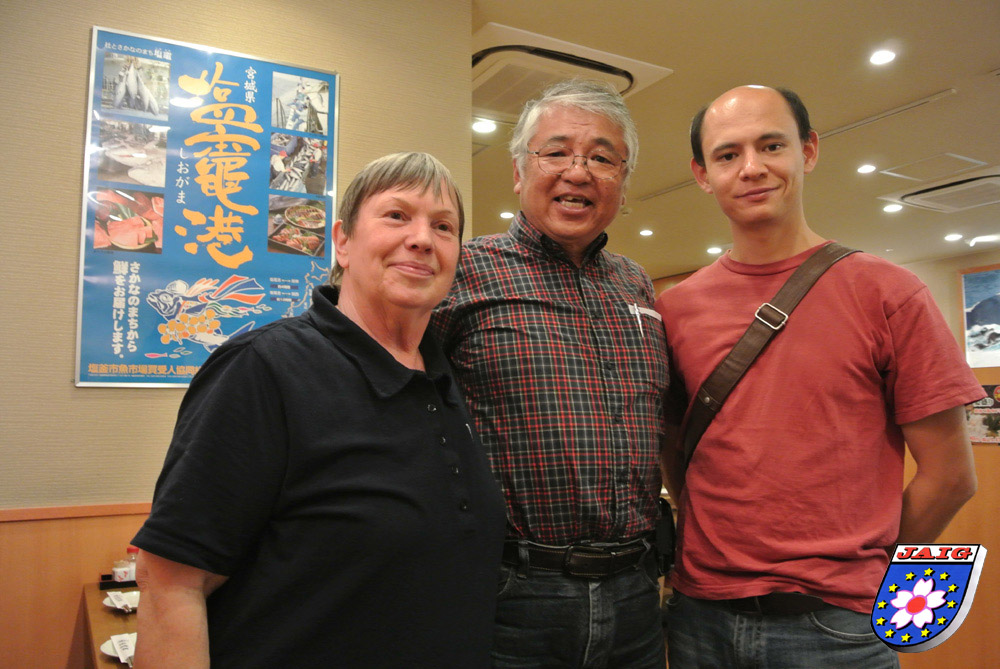 Am Montagabend waren wir mit vier von Kuni’s Studienkollegen in einem Restaurant, nahe am Sendaier Bahnhof gelegen, verabredet. Waehrend wir froehlich plaudertern und geniesserisch assen, ging die Tuere auf - und wir trauten kaum unseren Augen - wen sahen wir hereinkommen - Shimamoto-san, JA3USA, aus Osaka. „Mac“ war genauso ueberrascht, er war mit seinem Sohn sozusagen „dienstlich“ nach Sendai gekommen.