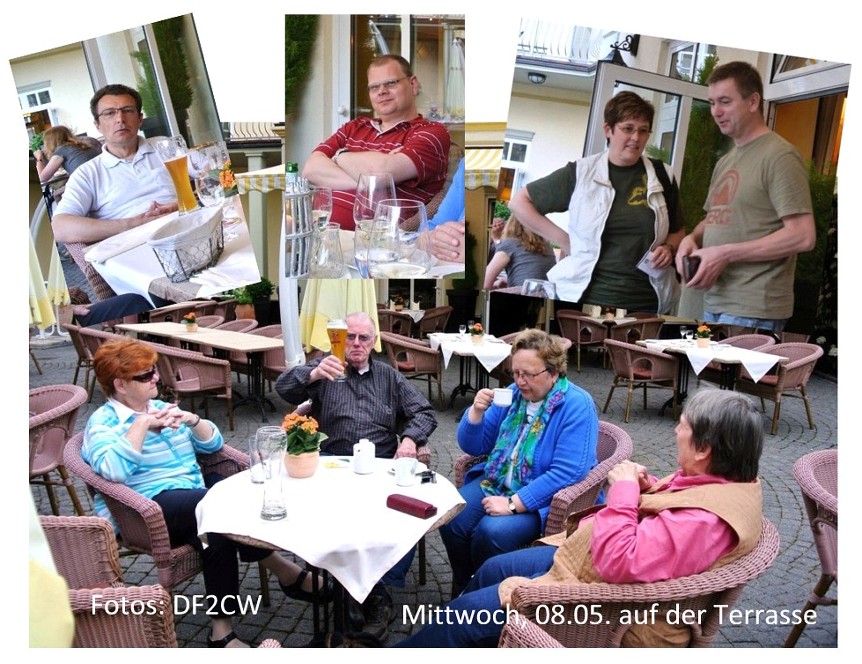 Auch in diesem Jahr haben wir uns wieder einen Tag frueher, also Mittwoch, 08.05. auf den Weg nach Nierstein gemacht. Nach einer gemuetlichen, hindernisfreien Fahrt kamen wir zusammen mit Gerti gut in unserem Hotel an. Nach der Anmeldung und den ueblichen “Aufraeumungsarbeiten“ setzten wir uns in den Garten des Hotels und bestellten uns eine kleine Staerkung. Fuer eine Ueberraschung sorgte Jens, DL7UMA, der ploetzlich auf uns zukam. Er setzte sich zu uns und wir plauderten angeregt. Nach einer Weile kamen Hans, DF5AN mit seiner XYL Ruth dazu und spaeter noch Elmar, DG7YEO. So gab es bereits eine kleine JAIG-Runde. Nach dem Platzwechsel unter die Markise trafen spaeter auch Peter, DG0JT mit seiner XYL Heike, DE1JTH ein und wir blieben noch ziemlich lange in froehlicher Runde zusammen.