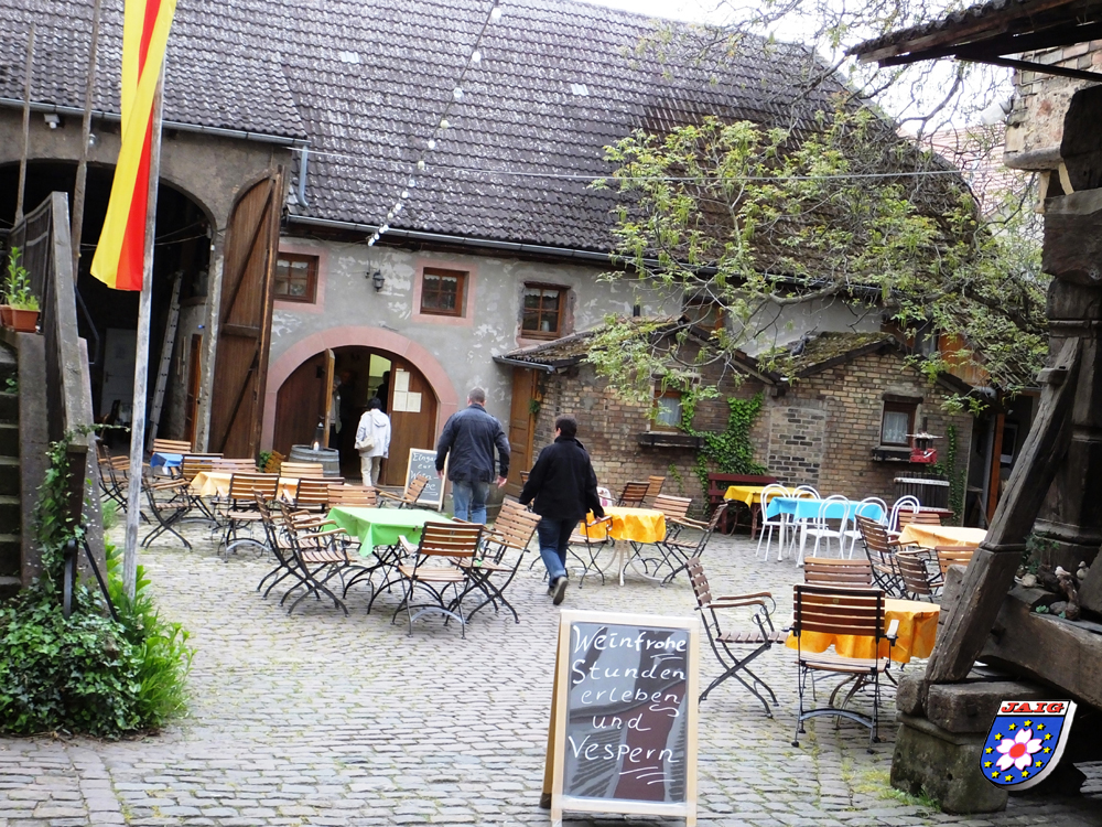 Nachdem wir uns frisch machen konnten und nach einer kleinen Verschnaufpause gingen wir alle gemeinsam (ca. 50 Personen) zum Abendessen in eine im Hof gelegene Strausswirtschaft / Restaurant in Nierstein. Es gab der Region entsprechende Bewirtung. Die Auswahl war wegen der Spezialitaeten-Kueche diskussionsfreudig und war erstaunlich fremd aber lecker. Wegen des lautstarken Unterhaltungspegels gingen wir zurueck zum Hotel, wo die Gespraeche bis in die spaeten Abendstunden weitergefuehrt wurden.