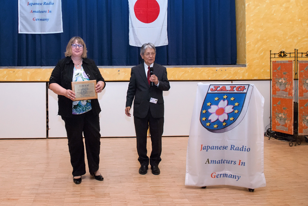 Eine Mitgliederehrung gab es fuer Silvia, DL5SCC und ihren Mann Achim, DG4SAB fuer hervorragende Beteiligung bzw. Ideen fuer die JAIG-Gruppe und sie bekam auch eine Ehrenurkunde. Achim konnte leider die Ehrenurkunde nicht persoenlich entgegen nehmen.