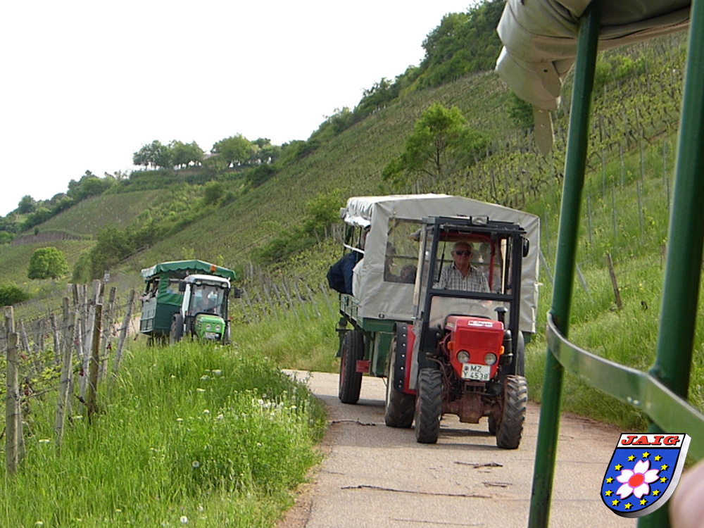 Nach 17 Uhr standen dann die drei Traktoren mit „Haenger“ zur Weinbergfahrt bereit. Wir kletterten in die Planwagen und gegen 17.30 h konnte es losgehen. Fuer uns – und wohl auch fuer alle Freunde – war es die erste Fahrt durch die Weinberge. Es machte sehr viel Spass und die Fahrer beherrschten die „Kunst“, ueber die engen und manches Mal buckligen, schmalen Wege zu kurven. Gut gelaunt und gestaerkt kamen wir nach fast zwei Stunden wieder zurueck zum Hotel.