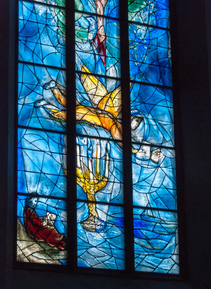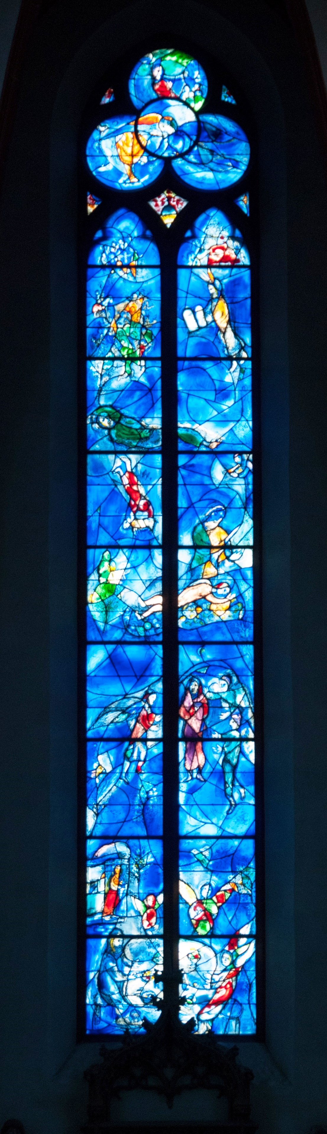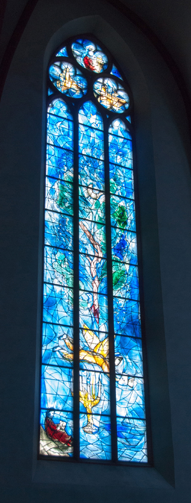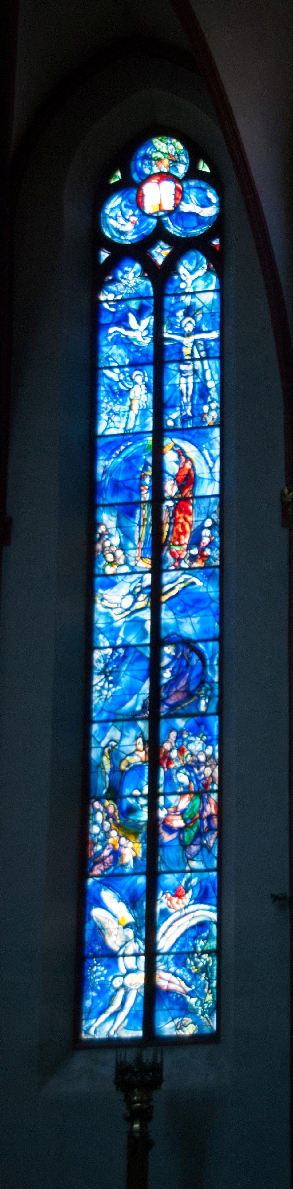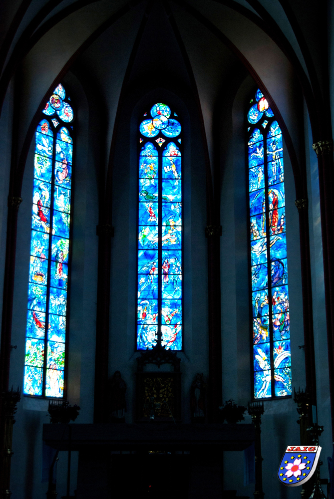 Es ist schon recht erstaunlich, dass das erste Fenster im Ostchor 1978, vom damals bereits 91-jaehrigen Chagall fertiggestellt wurde. Die beiden flankierenden Fenster folgten schon 1979. Aber nochmals begab sich der inzwischen 92jaehrige Kuenstler an die Arbeit, um auch die seitlichen Fenster des Ostchores zu schaffen. Ein mutiger Entschluss, da diese Fenster von der Flaeche her deutlich groesser sind als die Mittelfenster. Trotzdem, am 10. September 1981 wurden sie in einer Feier mit viel geladener Prominenz uebergeben. Uebrigens, die Glasflaeche aller Fenster im Ostchor betraegt 107,60 qm!!