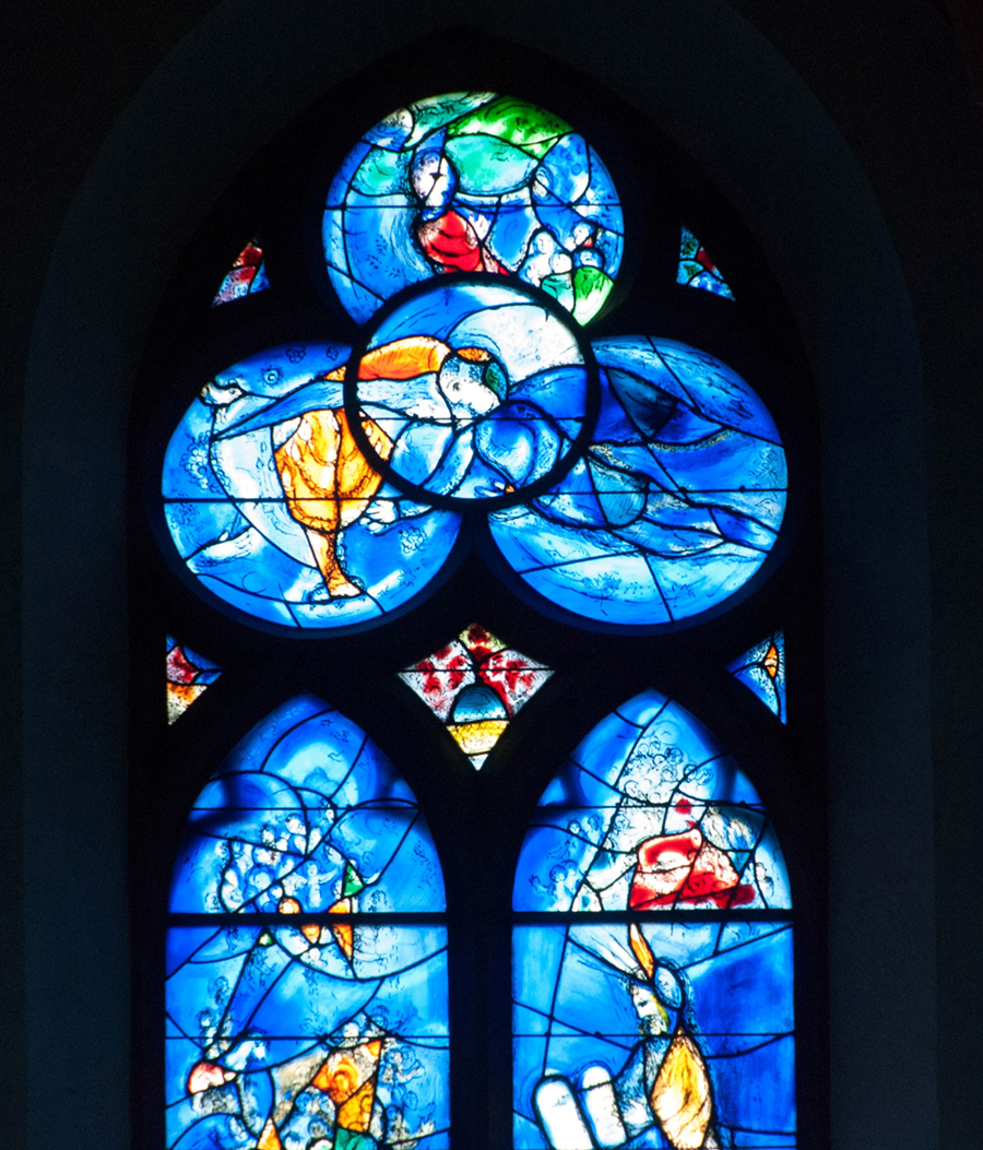 Voellig ueberraschend schuf Marc Chagall Ende 1982 - im 96. Lebensjahr - die Entwuerfe fuer die drei grossen, dreibahnigen Fenster im Querhaus, die er im November 1984 vollendete. Nur wenige Monate spaeter, am 28. Maerz 1985 starb er.
