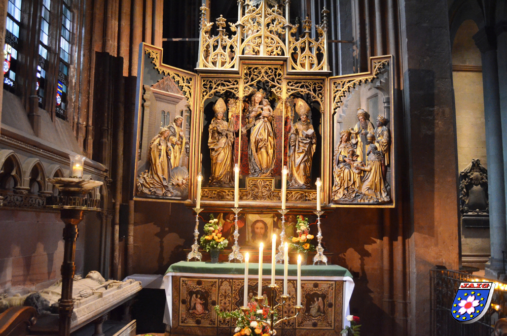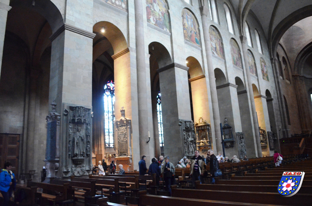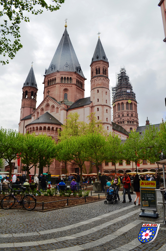 Am Samstag, 11.05.13, ist der Tag in Mainz geplant. Und was waere besser, als so einen Tag mit einem Kirchenbesuch zu beginnen. In unserem Fall ist das der beruehmte Mainzer Dom. Das Besondere daran ist: wir bekommen eine individuelle Fuehrung vom Domdekan, Herrn Heckwolf. Zuvor haben wir noch genug Zeit, in Ruhe den grossen eindrucksvollen Bau auf uns wirken und uns einstimmen zu lassen. Dann hatte ich - ehrlich gesagt - einen Vortrag mit ganz vielen Daten ueber beruehmte Personen des Mainzer Domes erwartet, aber es kam etwas anders: wir wurden ausfuehrlich ueber die Baugeschichte unterrichtet.