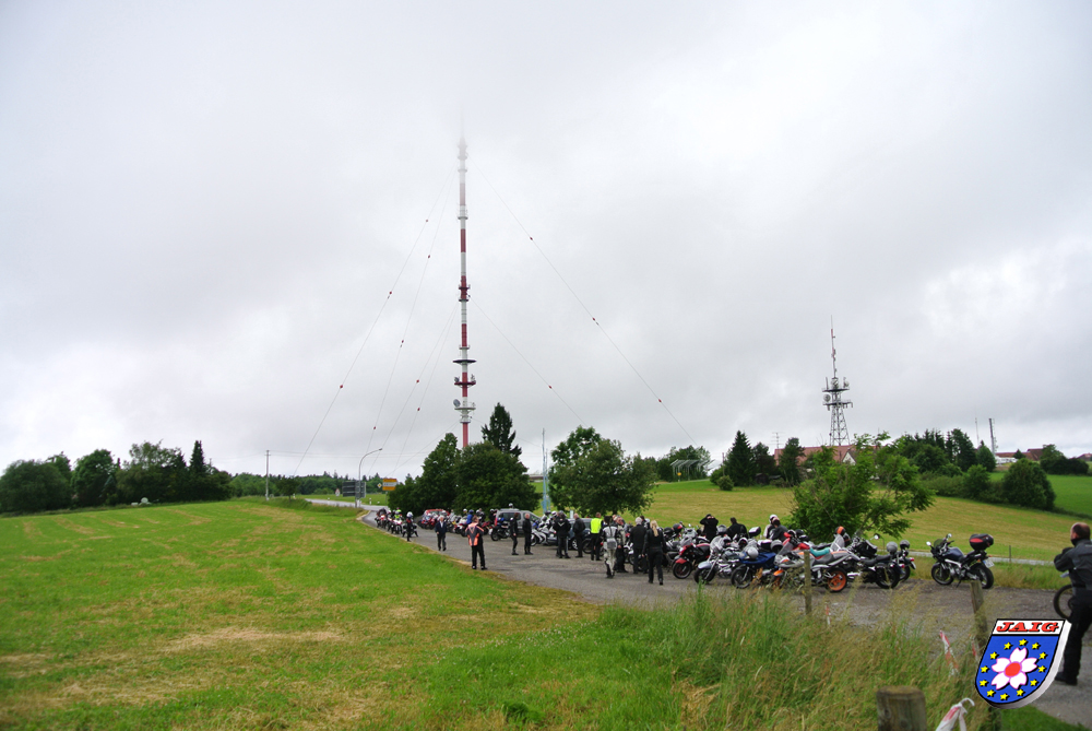 Der Regen hatte zwischenzeitlich aufgehoert und so machten wir einen Spaziergang ueber den „Prominentenpfad“ sowie den „schwaebisch-allemannischen Mundartweg“, der uns Eigenheiten dieser Sprache nahe brachte. Waehrend ich mir den angelegten Kraeutergarten ansah, ging Kuni zum Sendemasten, der stattliche 171 m hoch ist. Daneben sah er eine Ansammlung PKW’s, Wohnmobile und ein grosses, weisses Zelt. Er stellte fest, dass sich Funkamateure dort beschaeftigten. Als er zurueck kam, haben wir beschlossen, nach dem Mittagessen dort vorbei zu schauen.