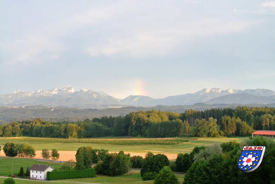 Der Blick auf den Wendelstein und die umliegenden Berge war wunderschoen. Nach einer Weile begann es in den Bergen dunkler zu werden und wir konnten die Gewitter gut beobachten, die an den Bergen entlang "wanderten". Als sich die Wolken wieder verzogen, bewunderten wir einen Regenbogen, der sich abzeichnete. Im anschliessenden Sonnenschein strahlten die Berggipfel, fast schien es, als waeren sie angeschneit.