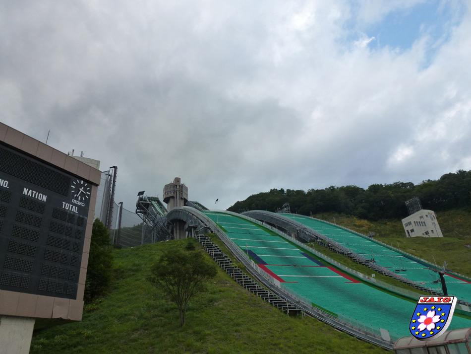 Unsere Freunde wollten uns Hakuba zeigen und wir freuten uns auf den Besuch in den olympischen Gefilden. Zu dieser Jahreszeit ist es dort sehr ruhig, viele Hotels und Pensionen sind geschlossen (wie bei uns auch). Sie sind teilweise mitten im Wald gebaut und so wirkt das ganze recht verstreut. Im Winter bei Schnee ist das alles sicherlich viel schoener (und romantischer).Wir fuhren zu den beiden Sprungschanzen und ... auf der kleineren, die mit gruenen Matten belegt war, uebte ein einsamer Skispringer. Nach dem Sprung wurden die Matten mit Wasser besprueht, aber weitere Spruenge konnten wir nicht mehr beobachten. Leider hatten sich die Berge bis weit herunter ihre Tarnkappen uebergezogen, sodass uns kein Blick auf die Gipfel gegoennt war. Aber ich denke, es haette uns vielleicht gar nicht so gut gefallen, denn Skipisten im Sommer sind nirgendwo ein so erfreulicher Anblick.