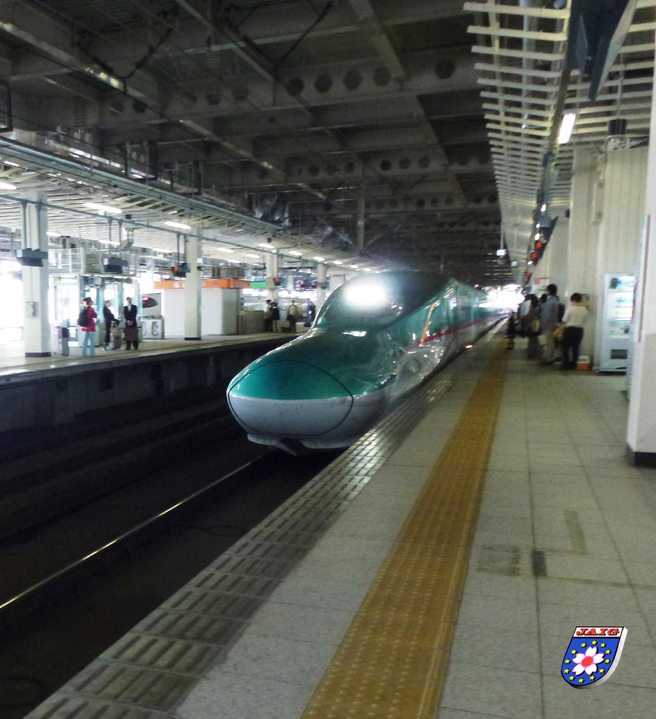 Der Shinkansen Asama brachte uns bis Omiya, wo wir fuer die Fahrt nach Sendai umsteigen mussten. Wir warteten also auf unseren naechsten Shinkansen - und was kam da eingefahren, der neue Shinkansen, Baureihe E5, "Hayabusa" mit seiner superlangen Schnauze. Diesen Zug haben wir bei unserem Japanbesuch im letzten Jahr schon bewundert, da sahen wir ihn im Bahnhof stehen vor einer Probefahrt. Ich gebe zu, ich freute mich (wie ein Kind), dass wir mit diesem bis zu 320 km/h schnellen "Wanderfalken" fahren konnten. Er ist komfortabel (wie eigentlich alle Shinkansenzuege), faehrt sehr leise und man spuert weder die Geschwindigkeit noch die Schienenwechsel. Es war wirklich das pure Vergnuegen, von der Puenktlichkeit und Zuverlaessigkeit brauchen wir ja gar nicht reden!