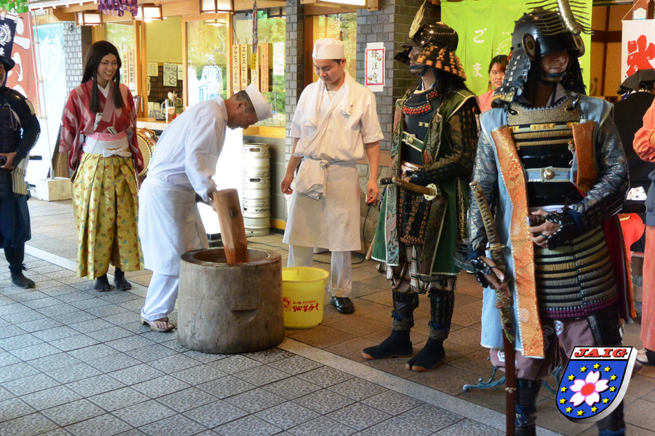 Am naechsten Tag brachte uns Kuni's Bruder zur Burgruine Aoba-jo, wo wir einen Rundgang machten und den Ausblick auf die Stadt und ihre Umgebung genossen. Wir machten Mittagspause und als wir gerade das Lokal verliessen, hoerten wir ploetzlich Trommelwirbel und Laerm. Der Sendaier Fuerst Date kam mit Gefolge (junge Leute in historischer Kleidung) auf den Platz und begruesste die Anwesenden. Danach wurde aus Reis "mochi" gemacht und wer wollte, konnte den schweren Holzschlaegel schwingen und den Reis "verkneten". Natuerlich schwang auch der Fuerst unter lauten "Kampfrufen" den Holzpruegel. Wir konnten dann "zunda"-mochi Kugeln (eine Sendaier Spezialitaet) essen.