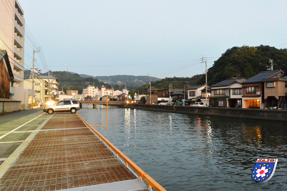 Nach einer Pause erkundeten wir die Umgebung unseres Hotels. Wir gingen am Fluss entlang in Richtung Hafen und sahen dort die Faehre liegen, die nach Kyushu faehrt, dabei konnten wir Fische beobachten, die sich ihr Abendessen mit Spruengen aus der Luft holten. Und eine recht interessante Loesung fuer Parkprobleme gab es auch zu bestaunen: