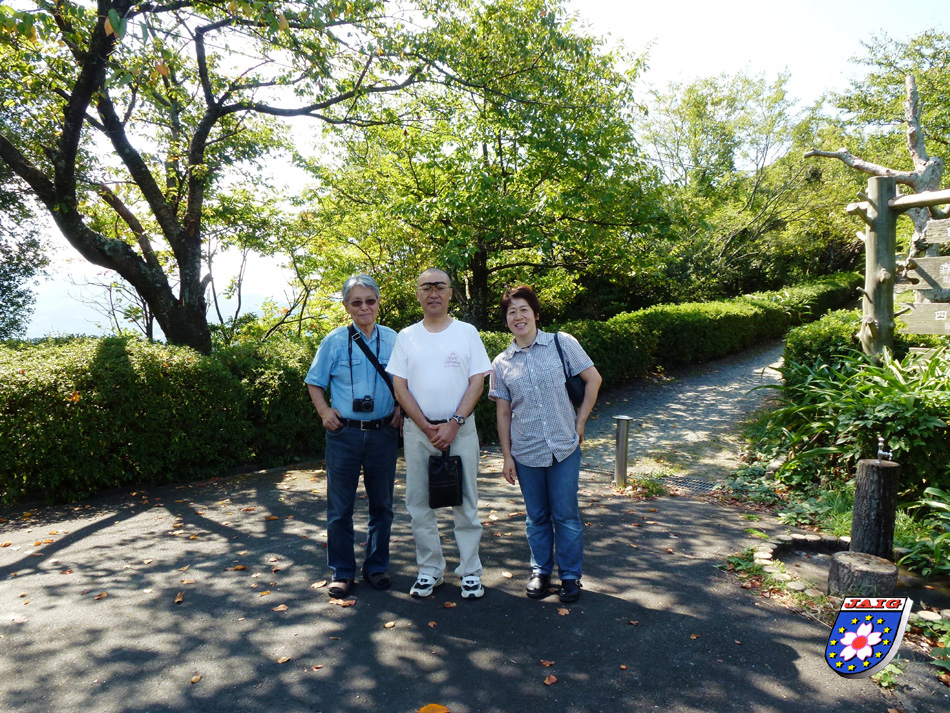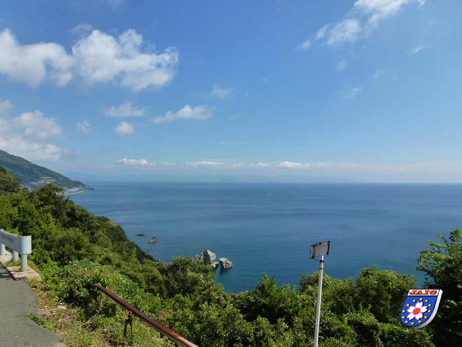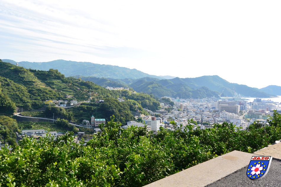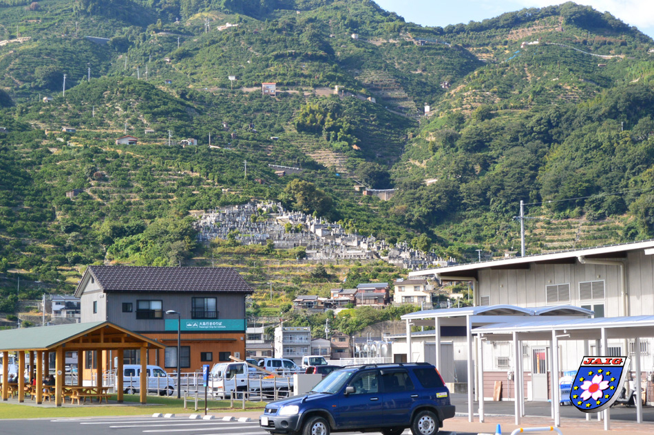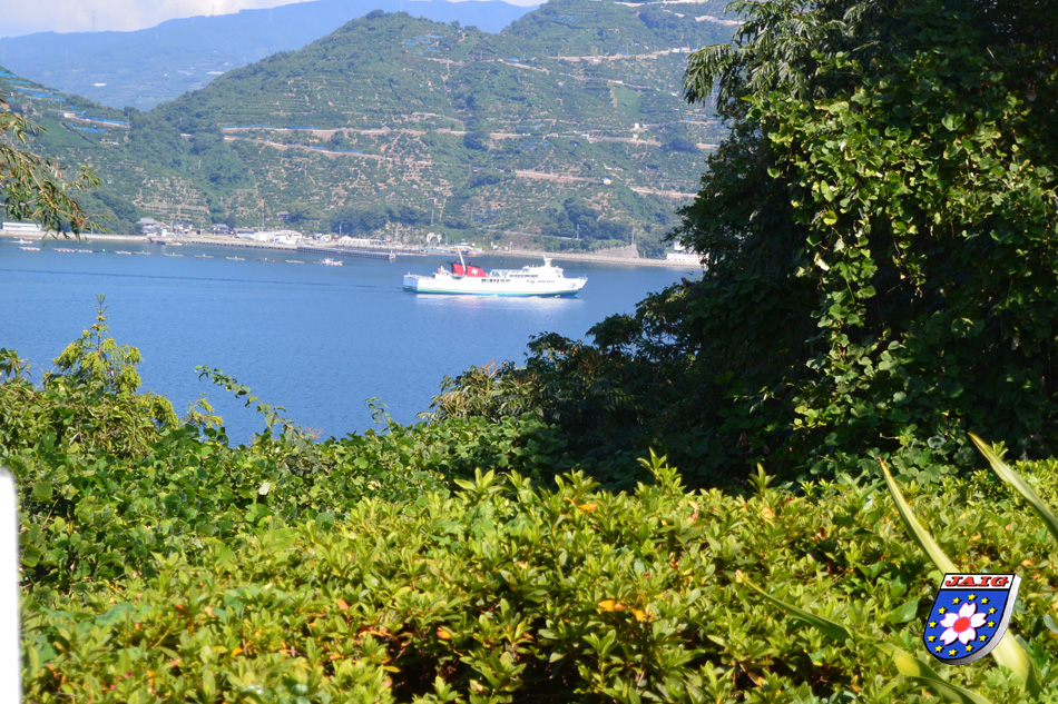 Wir warteten auf Hase-san und er kam puenktlich mit seiner XYL, er hatte sich Zeit fuer uns genommen und so fuhren wir an die schoensten Aussichtspunkte in der Umgebung. Als erstes besuchten wir die Suwasaki Halbinsel, die als Erholungsgebiet ausgewiesen ist und von der wir einen herrlichen Blick auf Yawatahama hatten. Danach ging es ueber schmale Strassen in vielen Kurven bergab und bergauf und wir fuehlten uns in die Weinberge bzw. Apfelterrassen in Suedtirol versetzt.