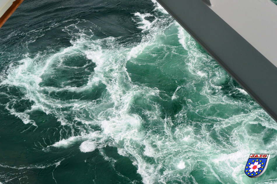 Langsam marschierten wir in Richtung Grosse Bruecke "Naruto Ohashi" und gingen unter der Autobahn auf der Fussgaengerbruecke ca. 500 m bis zum "grossen Strudel". Das Wasser toste unter uns und langsam kamen wir quasi ins Zentrum, direkt ueber dem Strudel. Es war faszinierend anzusehen. Schiffe fuhren ganz nahe an die Strudel heran und ein bisschen Nervenkitzel musste ja sein, dann auch noch unter der Bruecke durch. Uns gefiel es besser, alles aus der "Vogelperspektive" zu beobachten. Langsam gingen wir wieder zurueck und fuhren zu unserem Hotel.