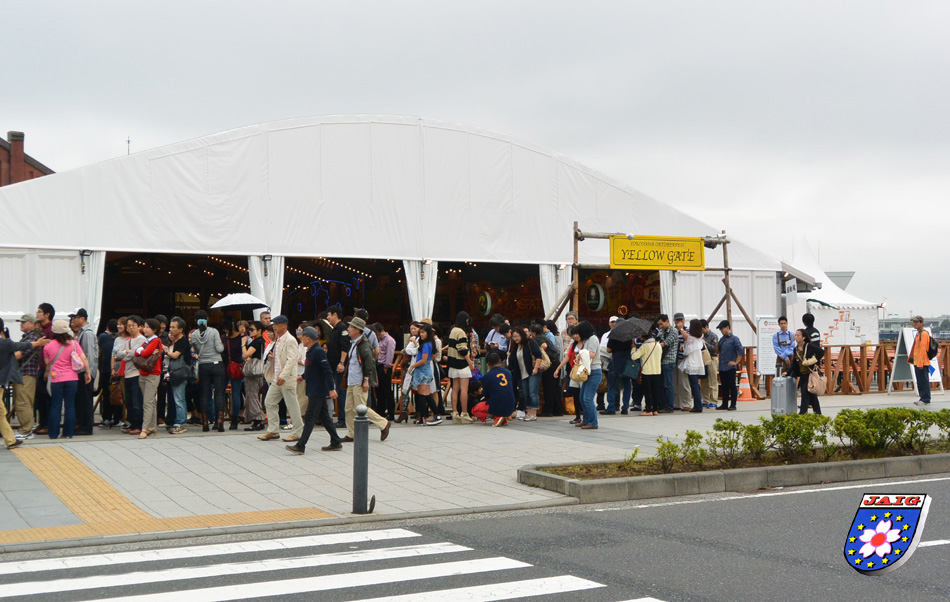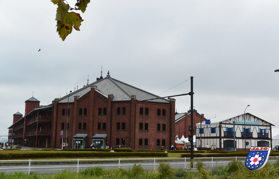Der Sonntag gehoerte dann uns, denn wir wollten im Hafengelaende spazieren gehen. Nach dem Fruehstueck marschierten wir bei strahlendem Sonnenschein los. Wir gingen zum Akarenga Lagerhaus, einem Bau aus Backsteinen. Neben diesem Haus gab es frueher eine Anlegestelle, an dieser explodierte am 30.11.1942 die "Uckermark" und zwei weitere deutsche Kriegsschiffe fingen Feuer (siehe auch unsere NEWS Nr. 111). Heute sind in diesem "roten Haus" Geschaefte und Restaurants zu finden, die aber alle noch geschlossen waren. Aber ... wir mussten lachen, denn auf dem Gelaende neben dem roten Haus sahen wir ein kleineres, weisses Haus mit blauen Fensterlaeden und der Aufschrift "Yokohama Oktoberfest", daneben etwas sehr vertrautes, naemlich ein Spaten-Bierzelt. Eine Menschenschlange wartete bereits, um rechtzeitig Einlass zu bekommen.