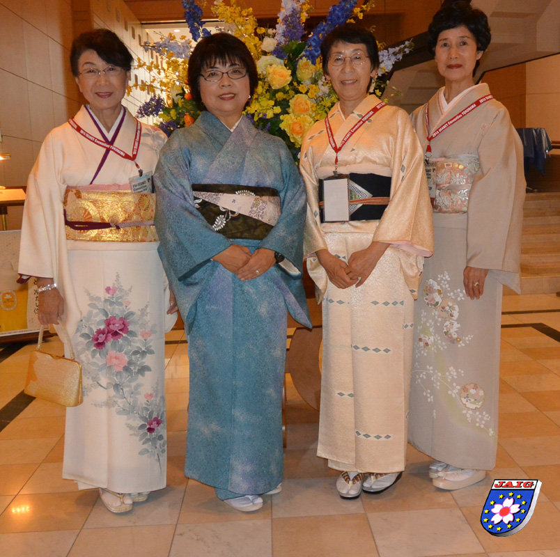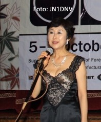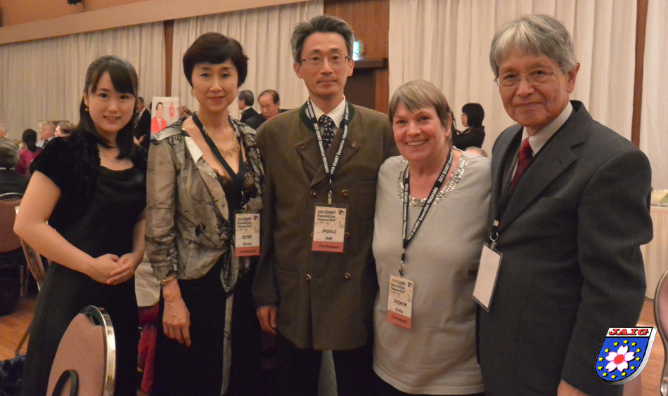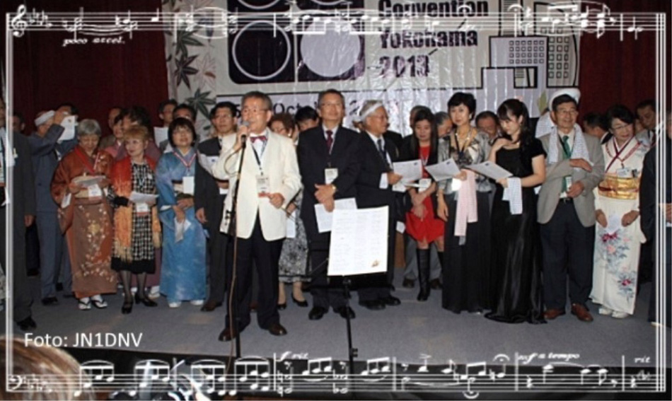 Danach begruesste Yonemura-san, JA1BRK, die Teilnehmer und es folgten noch einige "welcome"-Ansprachen. Die Gaeste aus den teilnehmenden Laendern wurden waehrend des Abends begruesst und vorgestellt. Es wurde gesungen und getanzt, teilweise auch in historischem Kostuem und unsere auch JAIG-Freundin Hiromi Ohori, JI0SBR hat wunderschoene japanische Lieder gesungen. Unser Freund aus Osaka, Miyamoto-san, JA3BEQ holte alle japanischen Teilnehmer auf die Buehne und ein "grosser Chor" wurde von "unserem Karajan" dirigiert.