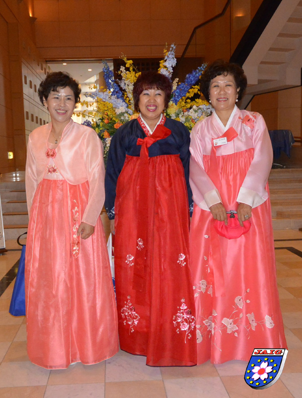 Abends ging es dann mit Bus zu einer Sporthalle zum Gala-Diner. Ein kurzer Fussmarsch und wir "zogen ein" in den Saal mit vielen runden Tischen, an denen cirka 200 Personen Platz fanden. Viele Japanerinnen hatten ihre Kimonos und Damen aus Korea ihre traditionellen, langen Kleider angezogen, ein sehr huebsches Bild. Auf der Buehne waren bereits verschiedene Trommeln aufgebaut und die Gaeste wurden von einer Gruppe mit Trommelwirbel empfangen.