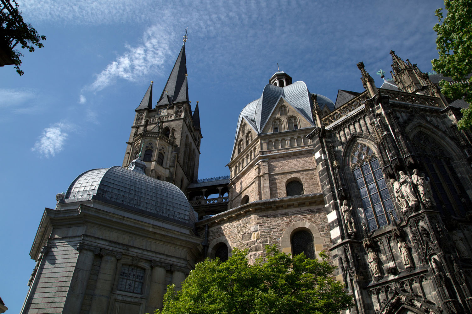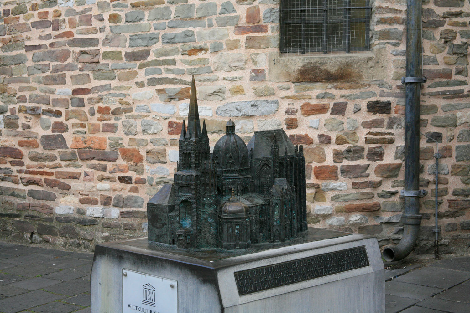 news121-31Bekanntestes Bauwerk von Aachen ist der Aachener Dom, Bischofskirche von Aachen. Karl der Grosse hat ihn bauen lassen, um 800 wurde er eingeweiht. Karl der Grosse wurde im Dom beigesetzt. Der Aachener Dom, sowie die Schatzkammer gehoerten zu den ersten Bauwerken, die in die Liste der UNESCO-Welterbestaetten aufgenommen wurden.