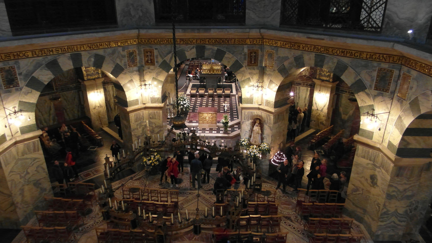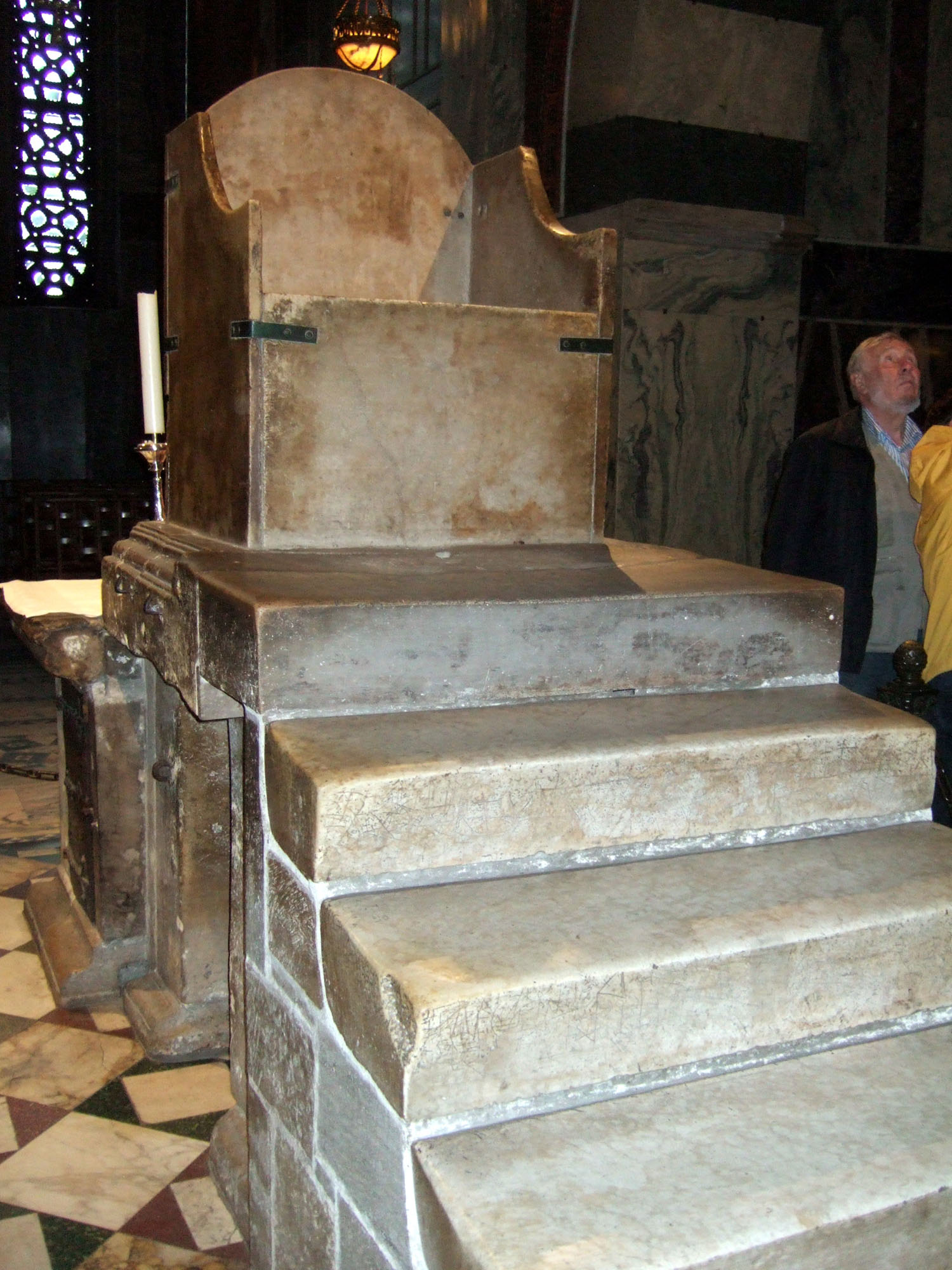 news121-32Der Koenigsthron ist einfach gestaltet. Er besteht aus vier Marmorplatten, welche, wie auch die Stufen, um 800 der Grabeskirche in Jerusalem entnommen wurden. Auf diesem Thron hat er den Messen im Dom beigewohnt.