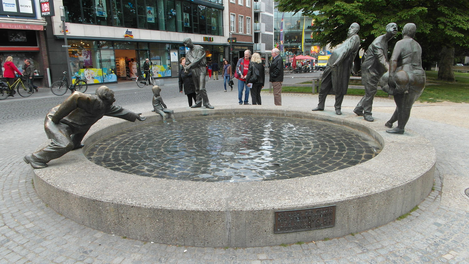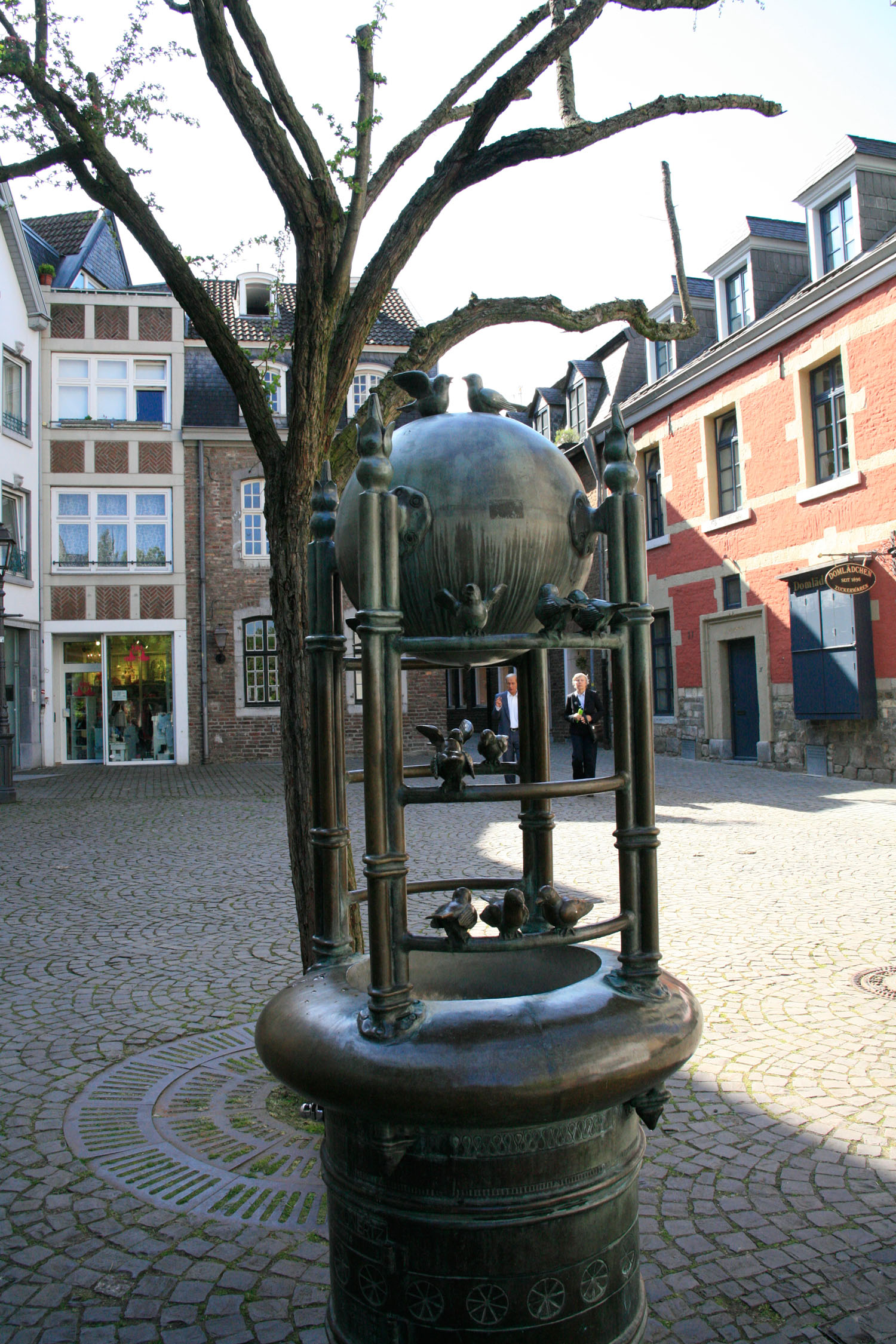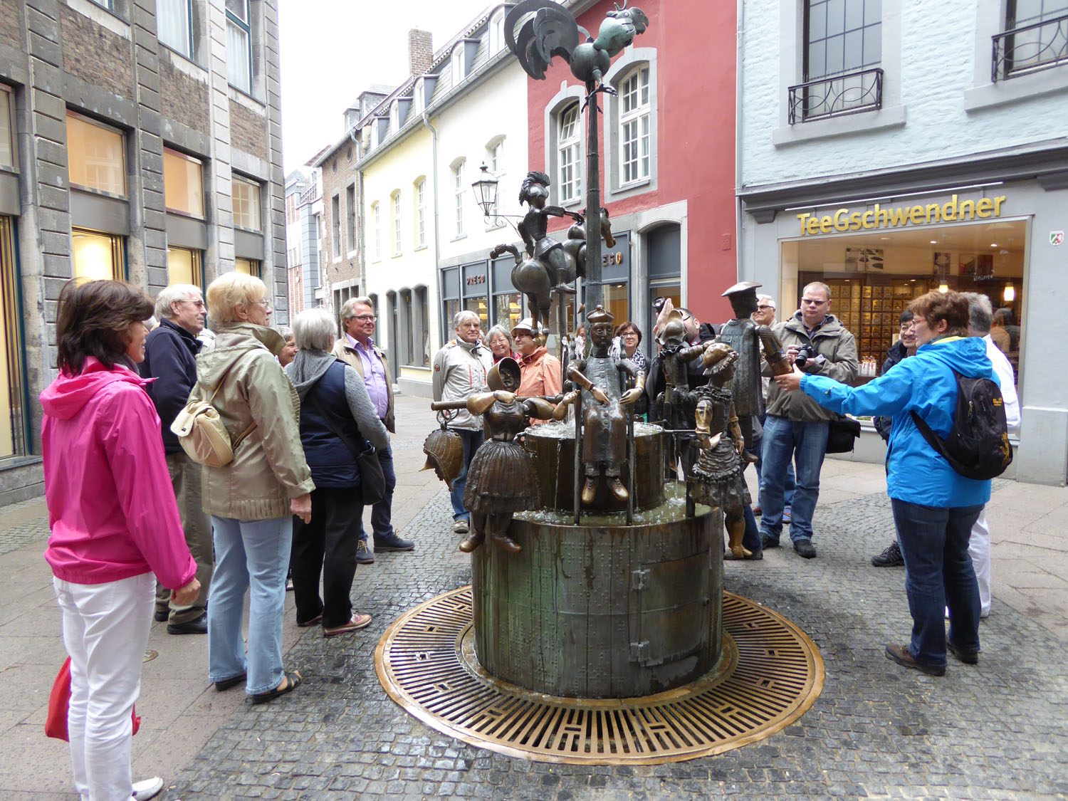news121-36Ein anderer Brunnen, den wir gesehen haben, ist der Puppenbrunnen. Der Puppenbrunnen steht an der Kraemerstrasse, der Verbindung zwischen Dom und Rathaus. Er wurde 1975 vom Aachener Bildhauer Bonifatius Stirnberg geschaffen. Die clevere Aachener Marktfrau macht mit ihrer rechten Hand eine Geste, als wuerde sie Muenzen zaehlen. Der Domherr an ihrer linken Seite steht natuerlich fuer die hohe Geistlichkeit. Das Maedchen mit dem Rueschenkleid symbolisiert die Tuchindustrie Aachens. Der Professor koennte in diesem Fall ein Theologe sein.